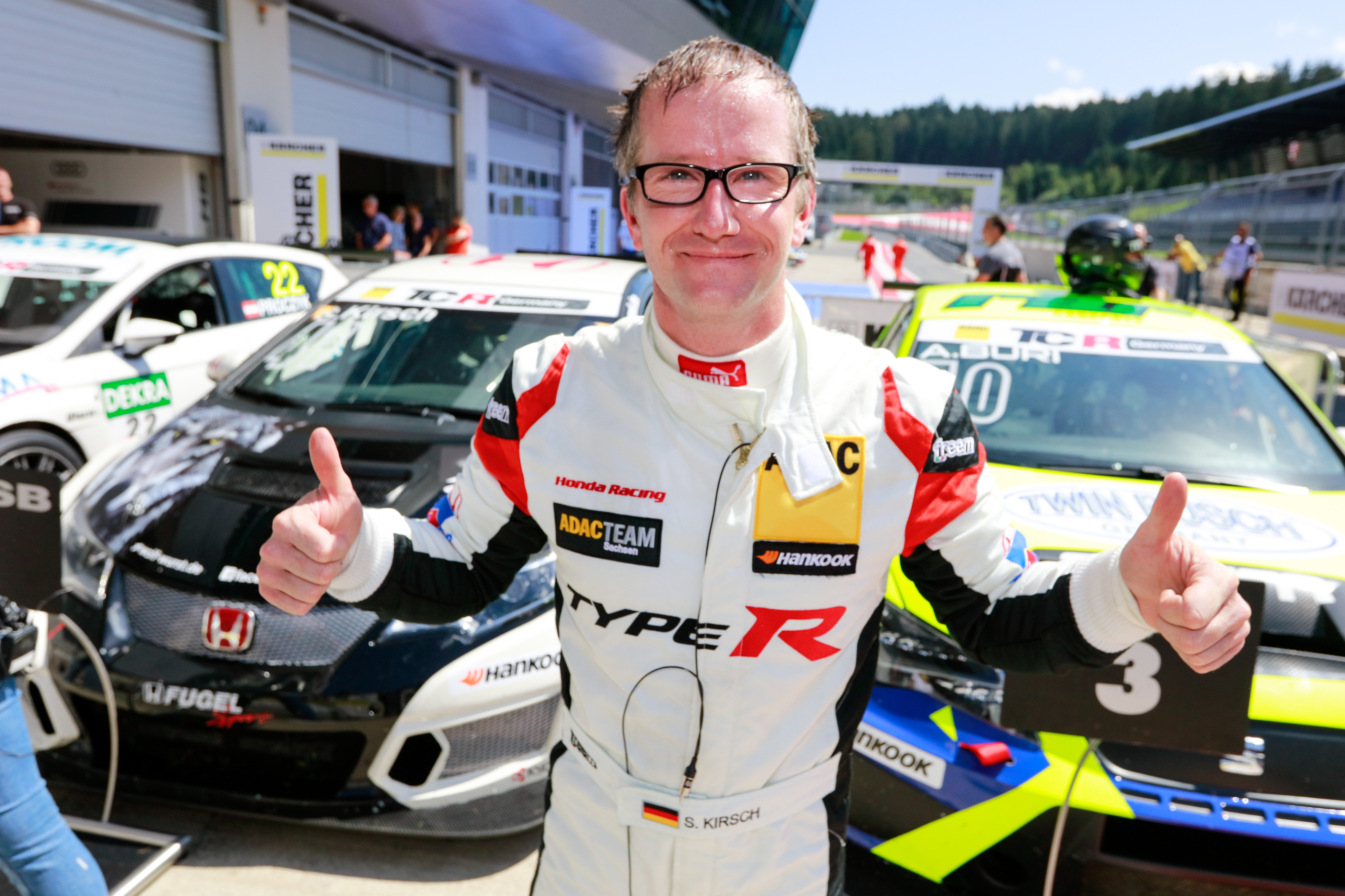 Spielberg. Steve Kirsch (36, Chemnitz, Team Honda ADAC) hat sein starkes Wochenende auf dem Red Bull Ring im österreichischen Spielberg mit seinem ersten Sieg in der ADAC TCR Germany gekrönt. Der 36-Jährige gewann ein ereignisreiches Rennen im Honda Civic TCR vor Lokalmatador Harald Proczyk (40, Österreich, HP Racing) im Seat Leon Cup Racer und Pole-Setter Antti Buri (27, Finnland, LMS Racing) in einem weiteren Seat. „Heute waren wir endlich mal dran. Es war nicht ganz einfach, der Start war ein bisschen durcheinander, mit der anschließenden Safety-Car-Phase“, sagte Kirsch: „Wir sind heute einfach glücklich. Das ist Balsam auf die Wunde von gestern mit meinem Ausfall und einfach eine richtig gute Wiedergutmachung, auch für das Team.“
