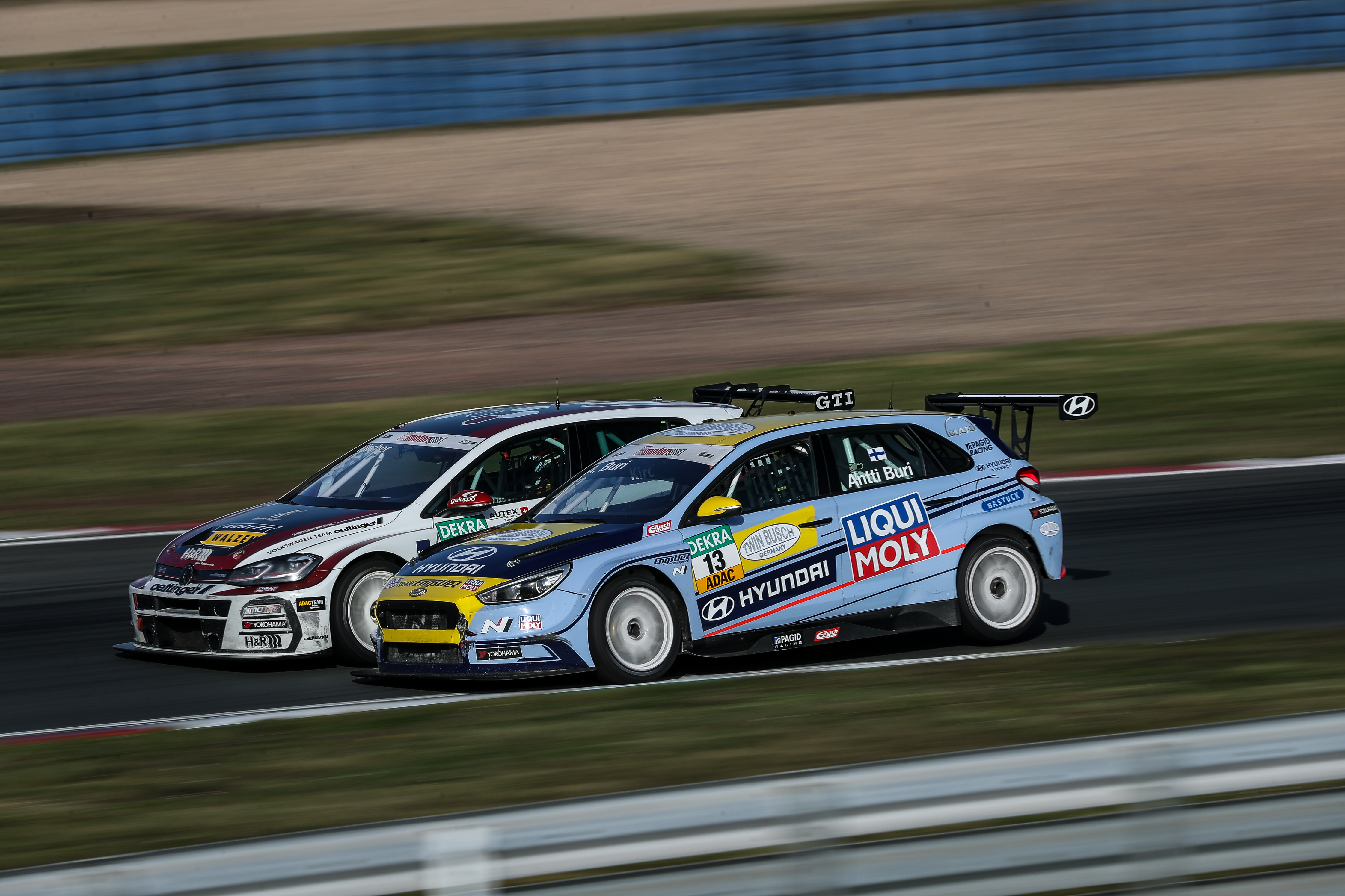Währenddessen hatten Harald Proczyk und Antti Buri alle Hände voll zu tun, die beiden überholten ihre Konkurrenten reihenweise und fanden sich schließlich in der Spitzengrube wieder. Als sich Gaststarter Luca Engstler (20, Wiggensbach, Hyundai Team Engstler) bei einem Überholmanöver gegen dem neuen Junior-Champion Marcel Fugel (20, Chemnitz, Honda ADAC Sachsen) verschätzte, kam es zu einem Kontakt zwischen den beiden Autos: Proczyk und Buri profitierten und verbesserten sich auf die Plätze zwei und drei. Engstler und Fugel konnten das Rennen nicht fortsetzen.