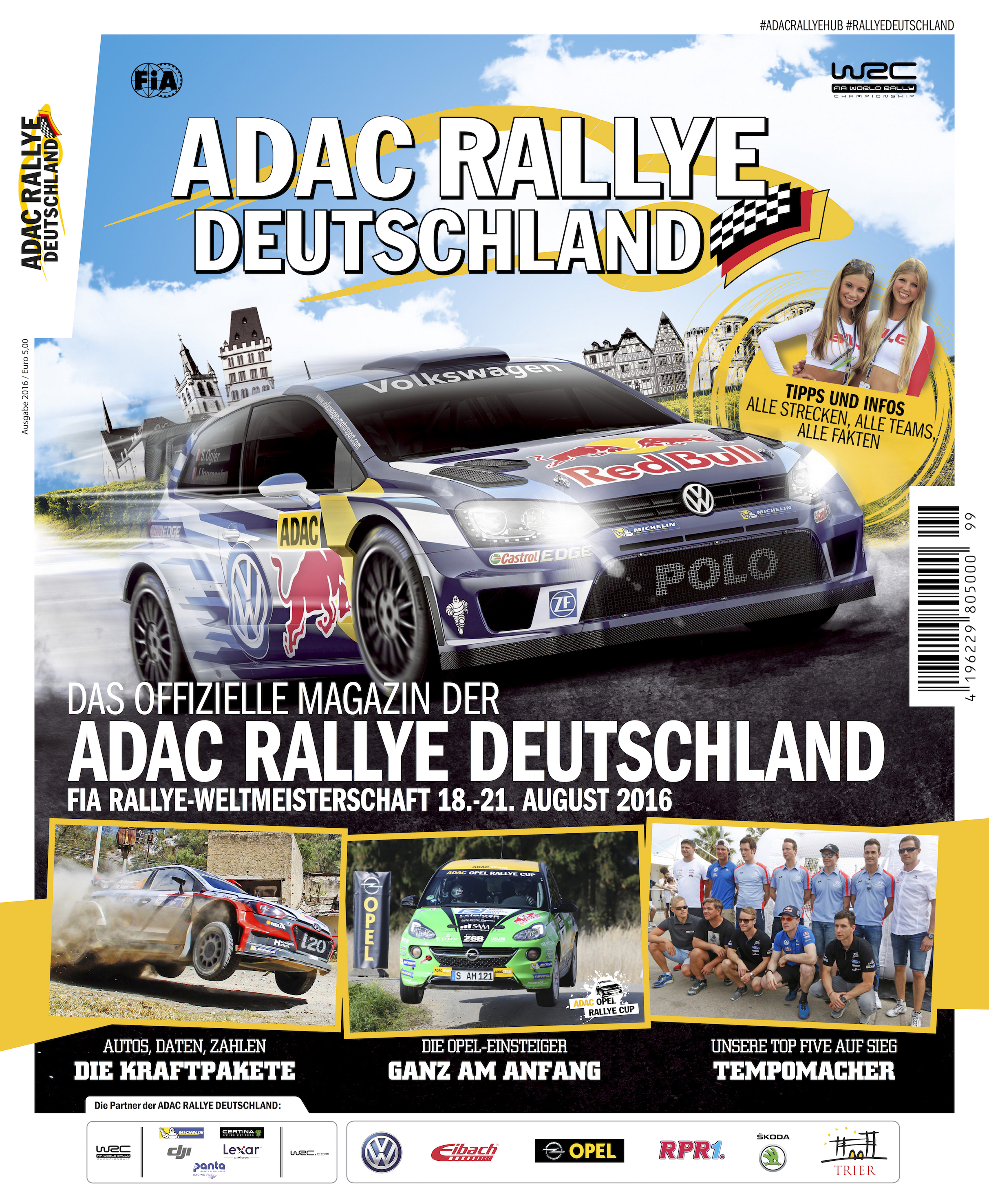 On 80 loaded pages, the readers will find everything there is to know about the 2016 ADAC Rallye Deutschland: What do the favourites think of the 18 Special Stages in the Eifel, Mosel, Palatinate and Saarland regions? What are the best stories from the action-packed history of the ADAC Rallye Deutschland? How is it possible to replace a carbon fibre fender in only three minutes? The magazine has interesting answers to these and a lot more questions.