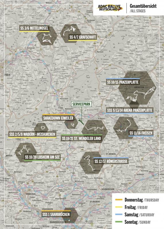 Am Donnerstagabend wird die Innenstadt von Saarbrücken zum WM-Schauplatz. Auf dem Tbilisser Platz vor dem Saarländischen Staatstheater findet der offizielle Show-Start der ADAC Rallye Deutschland statt. Bei dem für die Zuschauer kostenlosen Programmpunkt präsentieren sich alle Teams mit ihren Hightech-Boliden. Im Anschluss dürfen sich die Fans auf spektakuläre Action freuen: Von der Eröffnungsfeier weg starten die Teilnehmer zu einem Prolog auf einem City-Rundkurs in der Landeshauptstadt. Spannung ist dabei garantiert, denn die Zeiten gehen bereits in die Wertung ein. Bereits im Verlauf des Donnerstags findet der Shakedown, der für alle Teilnehmer vorgeschriebene Test vor der Rallye in Eiweiler, wenige Kilometer westlich des Bostalsees, statt.