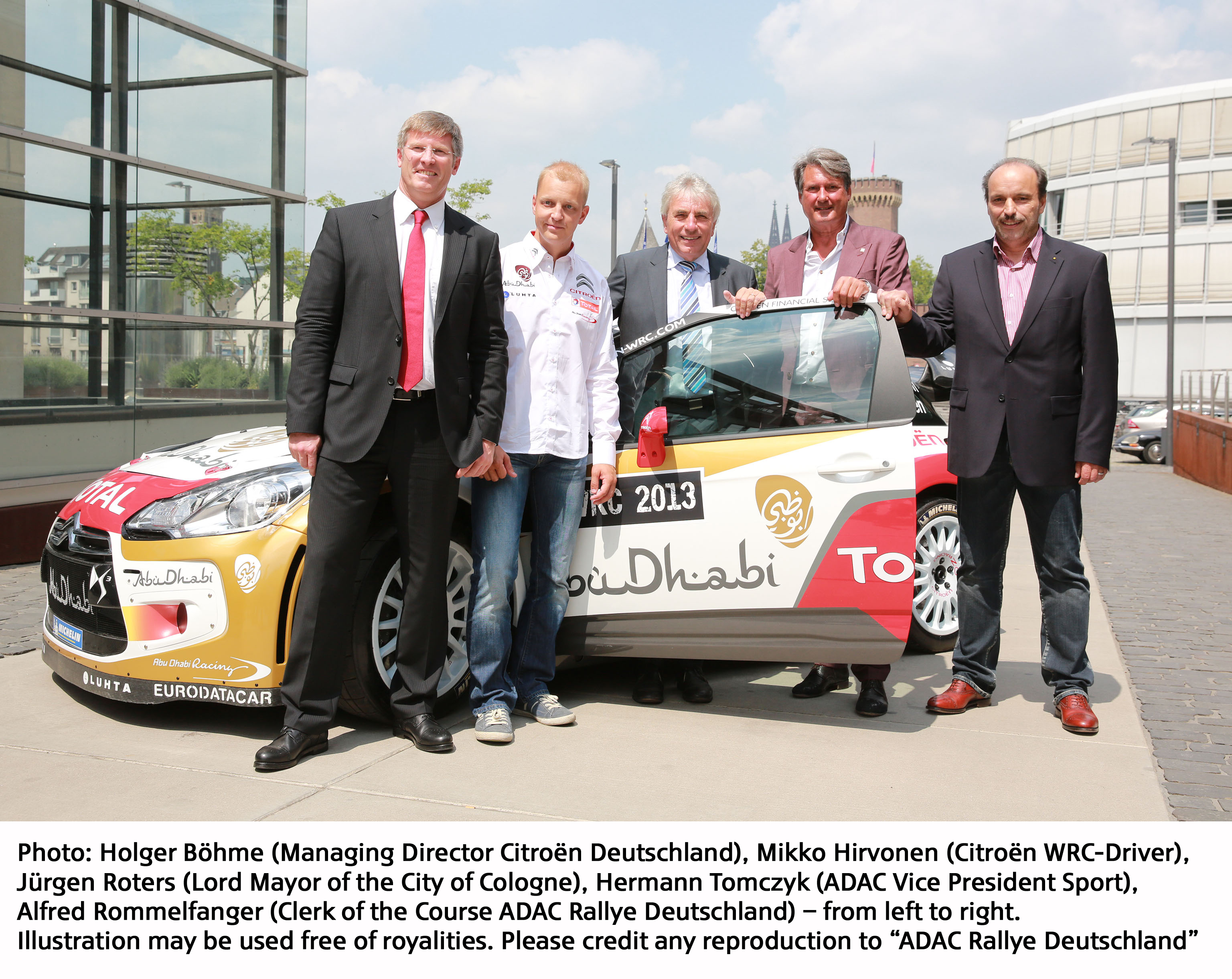 In a press conference at the German Sport and Olympic Museum in Cologne on 15 July 2013, attended by many journalists, ADAC presented the schedule for the driver presentation at the Cologne cathedral and shared information on the ADAC Rallye Deutschland. The Lord Mayor of Cologne, Mr Jürgen Roters, ADAC Motor Sport President Hermann Tomczyk, Mikko Hirvonen (Citroën Total Abu Dhabi World Rally Team) and ADAC Rallye Deutschland Clerk of the Course, Alfred Rommelfanger, took the journalists’ questions.