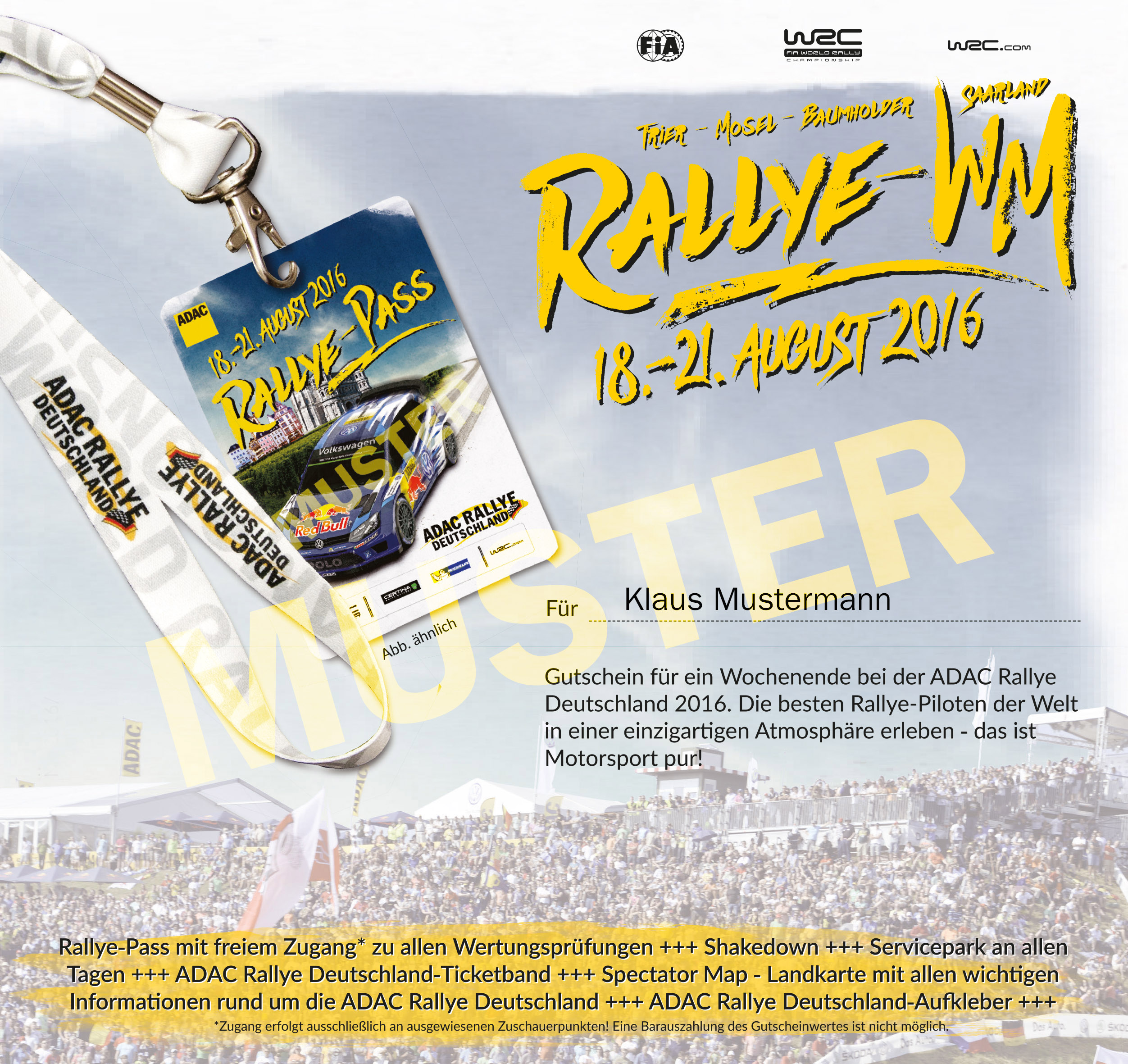 In pre-sales, rally and day passes for the 2016 ADAC Rallye Deutschland come at a discount and in attractive packages, for the first time including the official rally programme brochure (in German only). In pre-sales, a four-day rally pass costs €70 (€65 for ADAC members). The package including the programme brochure is more attractively priced than in past years. The rally pass covers:
