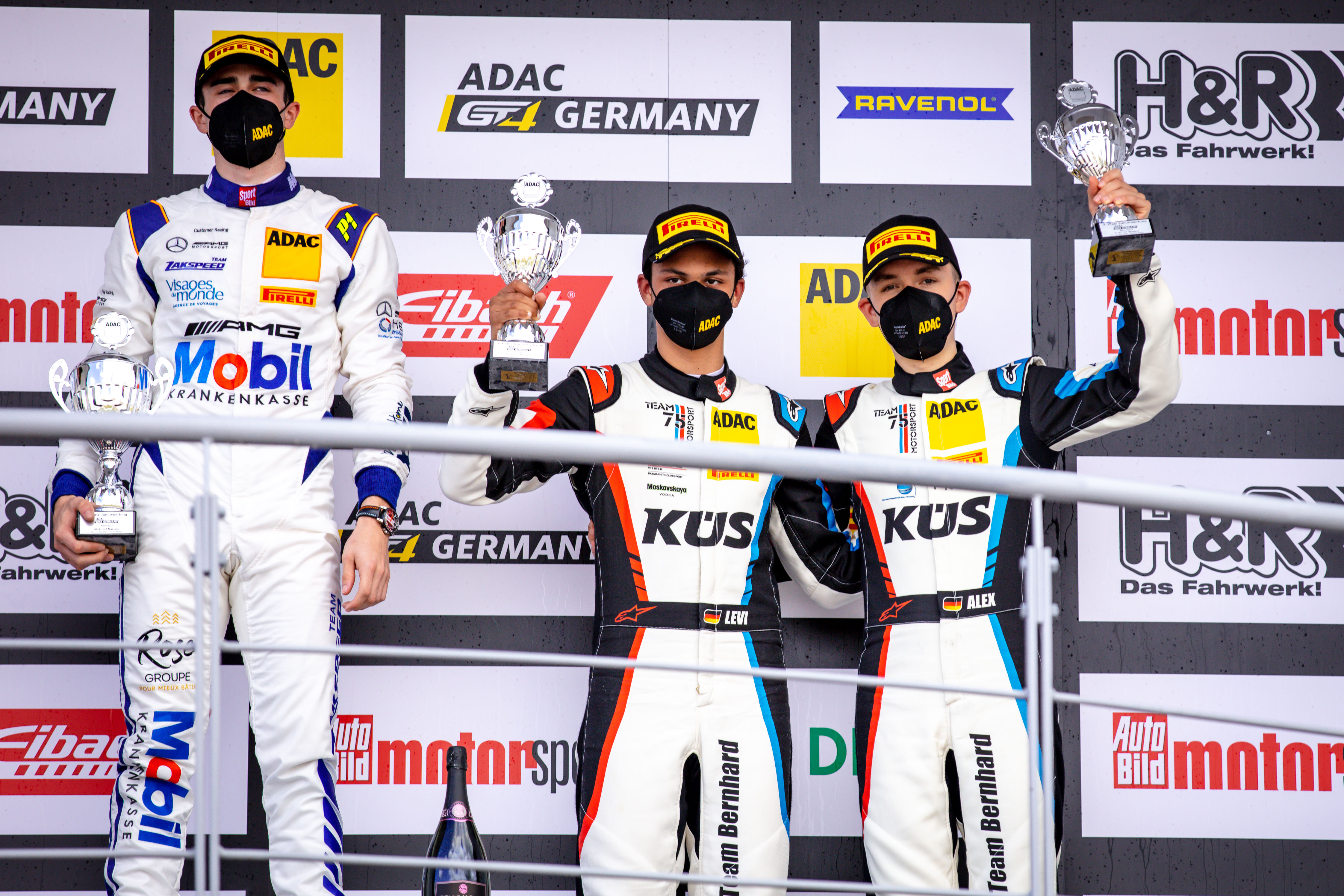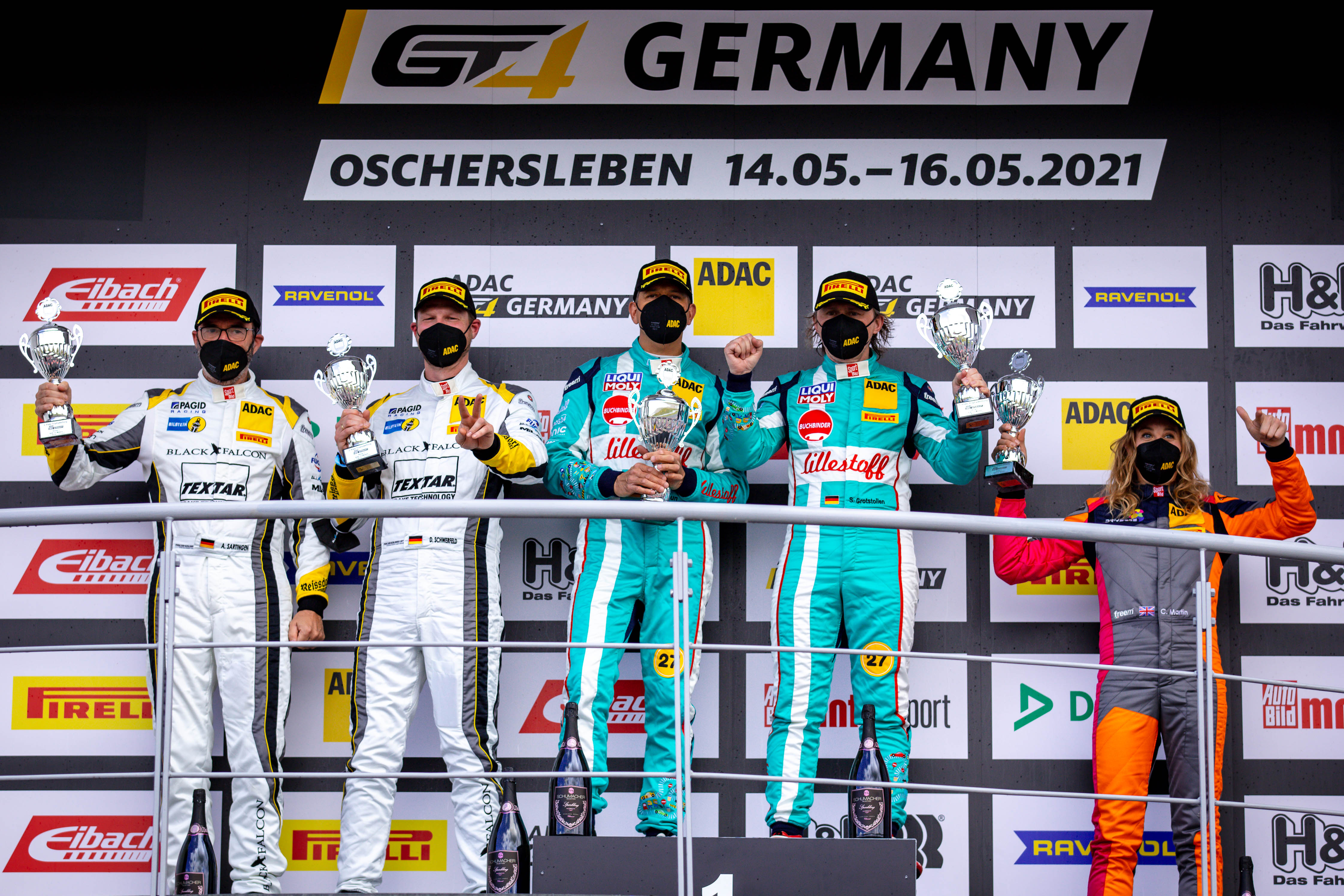 Podium Rennen 1 (v.l.): Marc de Fulgencio / Robin Falkenbach, Michael Schrey / Gabriele Piana, Andreas Wirth / Phil Dörr