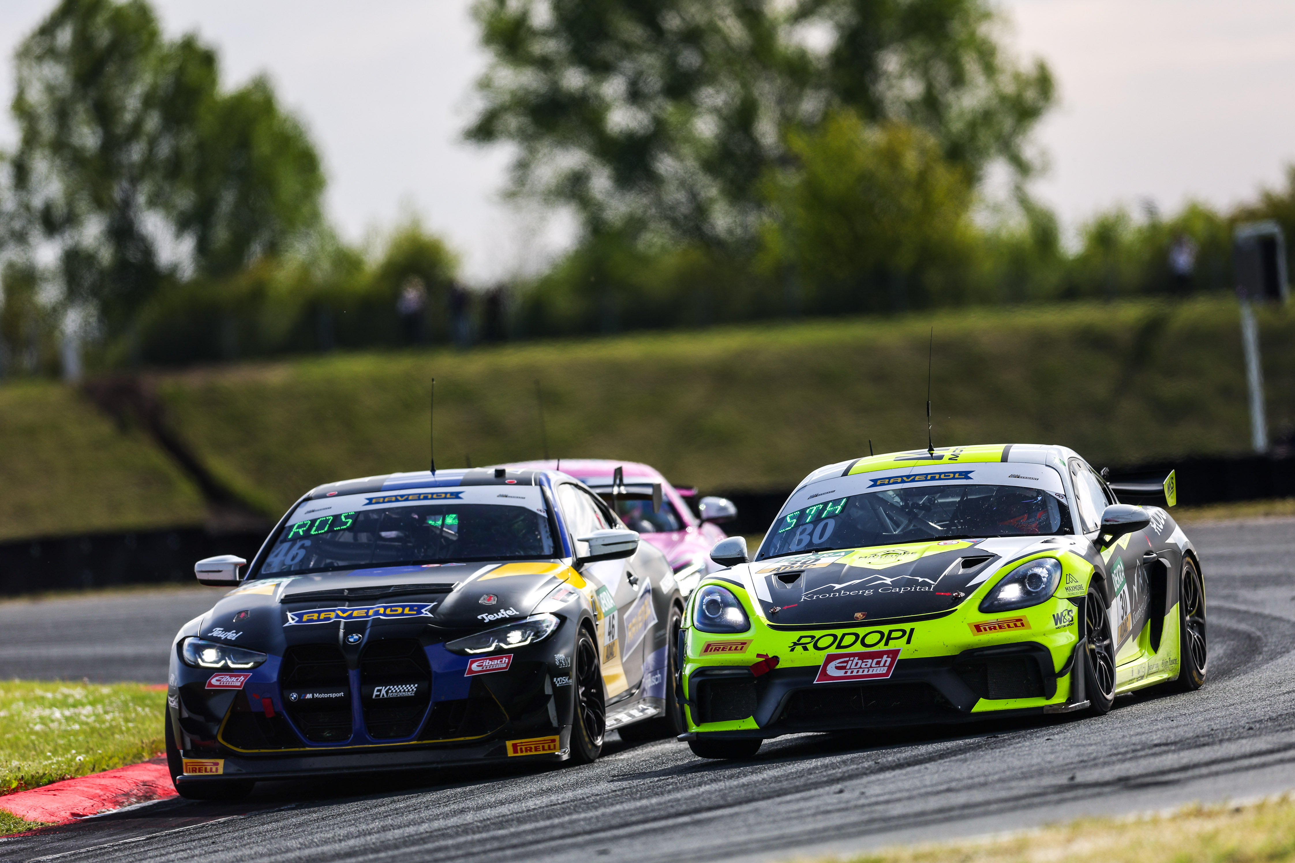 #46 FK Performance Motorsport / Leyton Fourie / Max Rosam / BMW M4 GT4 G82, #30 AVIA W&S Motorsport / Max Kronberg / Hendrik Still / Porsche 718 Cayman GT4 RS CS / Oschersleben