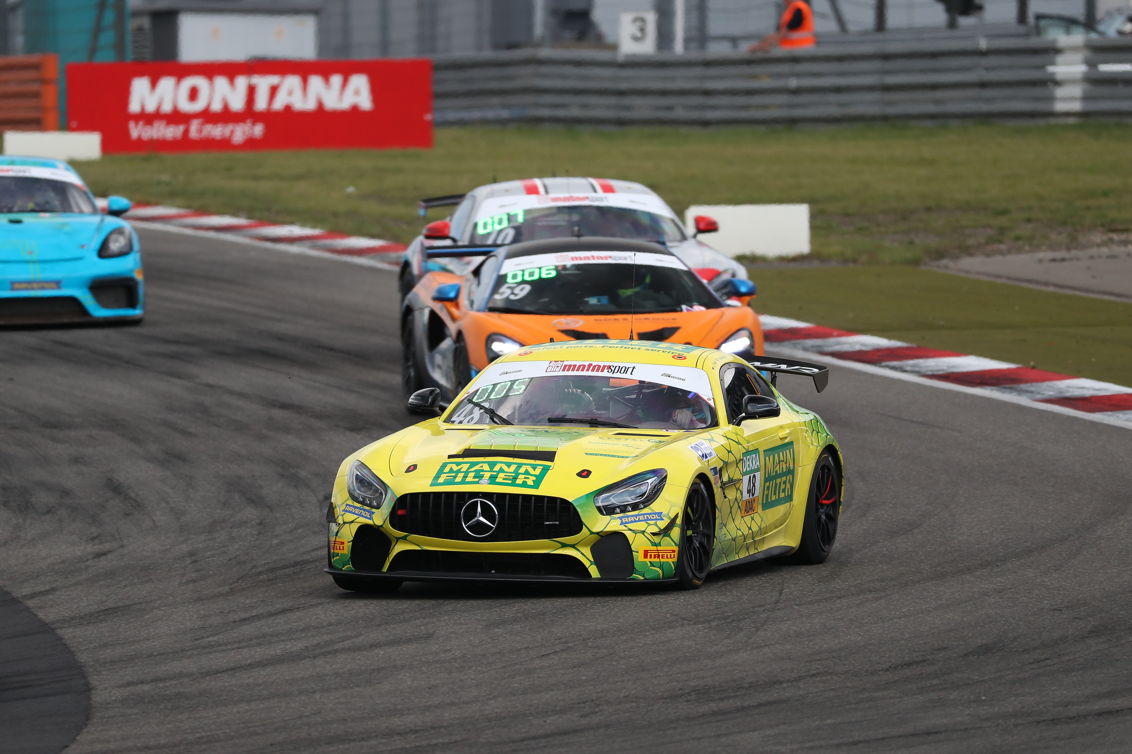 Die Führung erbte so Apothéloz, dessen Teamkollege Trefz bis zum Boxenstopp noch auf Rang vier lag. Das Mercedes-AMG-Duo profitierte dabei von einer kürzeren Boxenstoppstandzeit als die vor ihnen liegenden BMW von Gabriele Piana und der Porsche Møller Madsen, die aufgrund ihrer Erfolge vom Vortag länger stoppen mussten. "Ich wusste, dass die Beiden durch das Resultat vom Vortag länger in der Box stehen müssen. Somit bin ich etwas weniger Risiko eingegangen. Mit Köpfchen zu fahren, ist genau das Geheimnis der ADAC GT4 Germany", erklärte Trefz. Der gelbe Mercedes-AMG blieb bis zum vorzeitigen Rennende durch eine rote Flagge an der Spitze. Bei einem Regenschauer in der Schlussphase rutschte Patricija Stalidzane (18/München, Dörr Motorsport) im McLaren 570S GT4 in die Streckenbegrenzung, was eine weitere Safety-Car-Phase auslöste und aufgrund von Reparaturarbeiten an der Streckenbegrenzung einen vorzeitigen Rennabbruch erforderlich machte.
