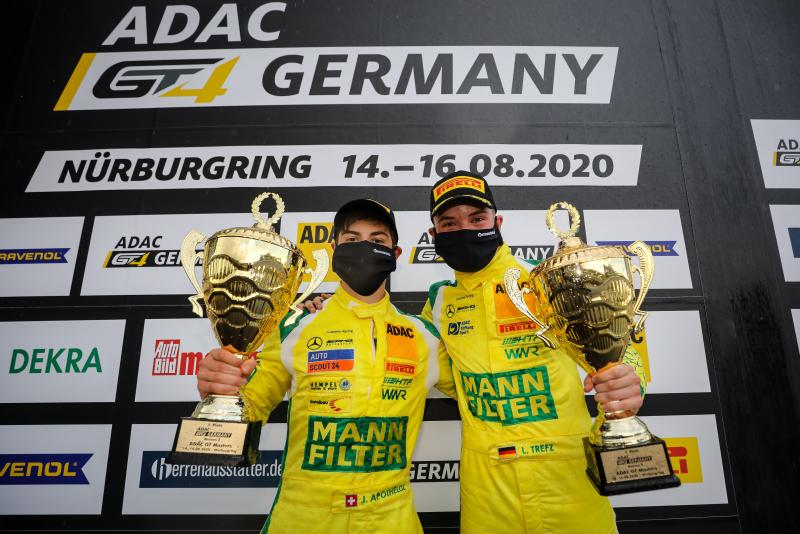 Nürburg. Wetterkapriolen im zweiten Rennen der ADAC GT4 Germany auf dem Nürburgring. Nach einem Regenschauer in der Schlussphase gewinnen Julien Apothéloz (19/CHE) und Luca Trefz (18/Wüstenrot, beide Mann-Filter HTP-Winward Motorsport) im Mercedes-AMG GT4 das vorzeitig mit einer roten Flagge abgebrochene Sonntagsrennen. Rang zwei geht wie am Vortag an Michael Schrey (37/Wallenhorst) und Gabriele Piana (33/ITA, beide Hofor Racing by Bonk Motorsport) im BMW M4 GT4, die sich in einem engen Duell gegen die Samstagssieger Jan Kasperlik (41/Huglfing) und Nicolai Møller Madsen (27/DNK, beide Team Allied-Racing) im Porsche 718 Cayman GT4 durchsetzen. "Ich bin jetzt natürlich richtig glücklich. Es ist mein zweiter Sieg in der ADAC GT4 Germany", strahlte ADAC Stiftung Sport-Förderpilot Trefz. "Wir gehen jetzt mit einem sehr guten Gefühl in das nächste Rennwochenende im September auf dem Hockenheimring."