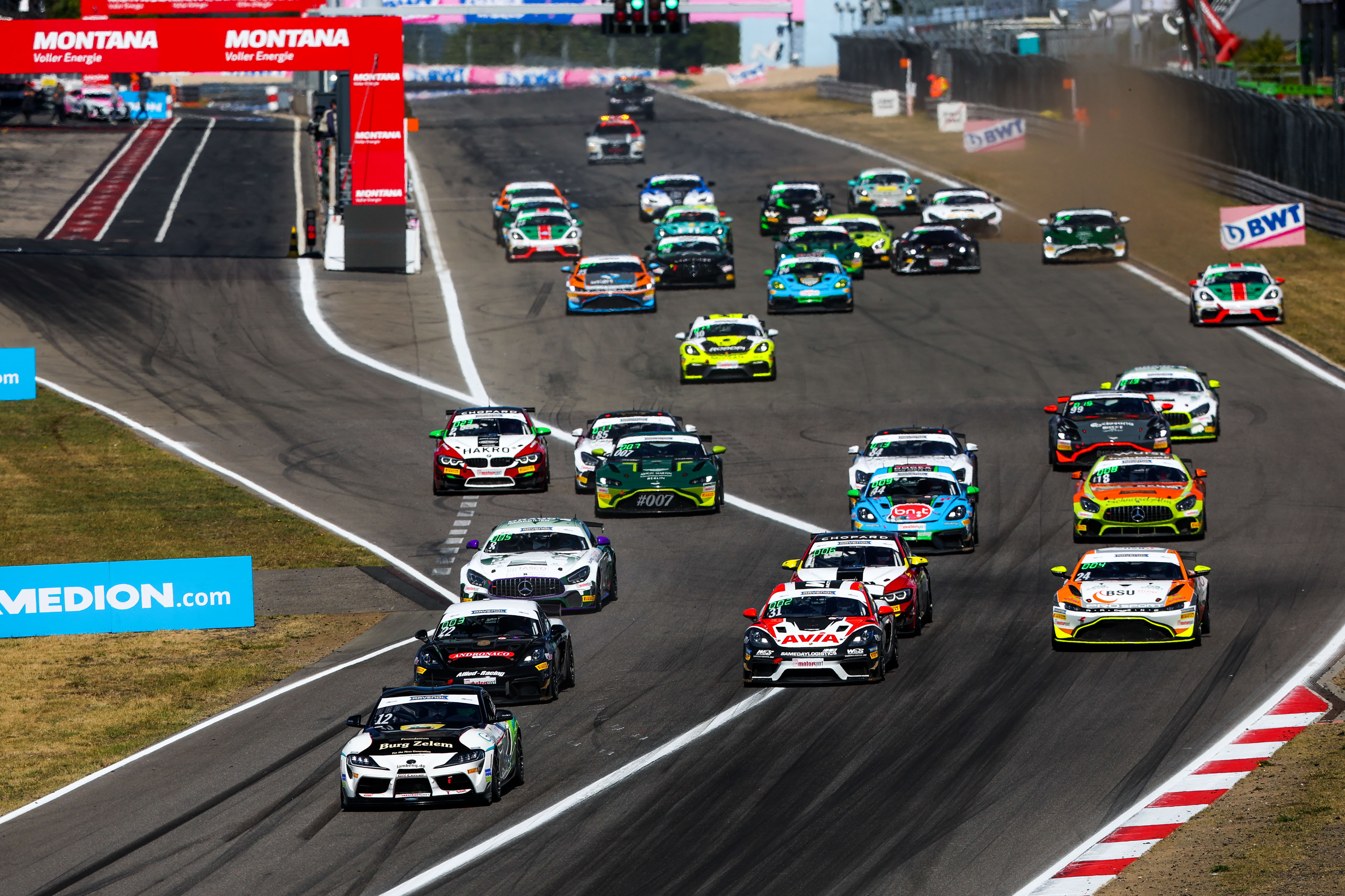 Lenerz begann das Rennen schon von der Pole-Position und setzte sich souverän an der Spitze ab. Im vorderen Mittelfeld gab es beim Start jedoch eine Kollision mit mehreren Fahrzeugen, die auch das Aus für die bisherigen Tabellenführer Indy Dontje (29/NLD) und Phil Dörr (21/Butzbach, beide Dörr Motorsport) im Aston Martin bedeutete. Hinter dem Toyota machten sich im weiteren Rennverlauf Møller Madsen im Porsche sowie Mike David Ortmann (22/Ahrensfelde, Prosport Racing) im Aston Martin auf den Plätzen zwei und drei breit. Während sich Lenerz mit kontinuierlich schnellen Rundenzeiten locker an der Spitze absetzte, musste Ortmann in der ersten Rennhälfte noch zwei Positionen abgeben und fuhr auf Platz fünf vor Böckmann im Schnitzelalm-Mercedes-AMG.