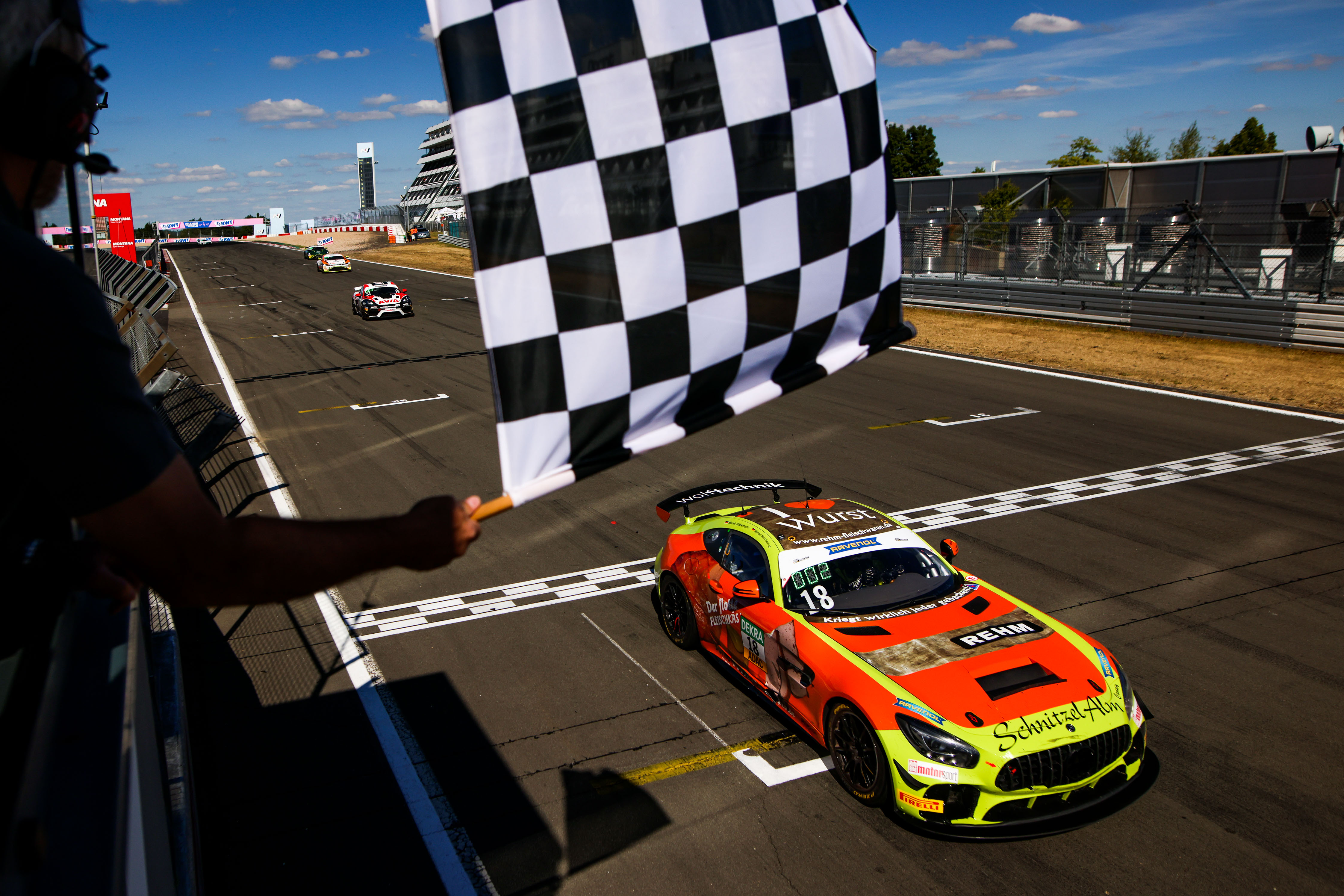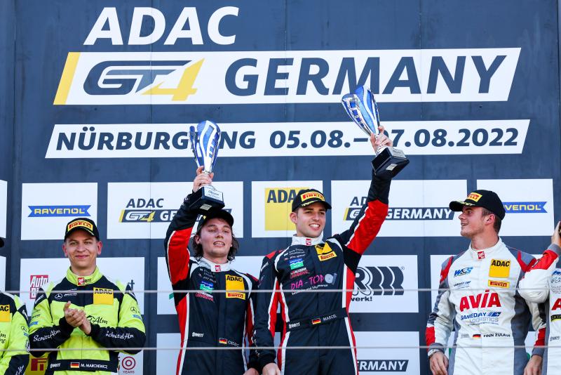 Hinter Piro entwickelte sich derweil ein sehenswerter Kampf um die weiteren Positionen auf dem Podium. Protagonist war dabei Marcel Marchewicz, der den Schnitzelalm-Mercedes-AMG von Böckmann übernommen hatte. Nach einem guten Boxenstopp lag er bereits auf Rang vier. Rund 15 Minuten vor Ende zog er an Markenkollegen Robin Falkenbach (20/Niederkassel, Drago Racing Team ZVO) vorbei auf Platz drei. Die letzten zehn Rennminuten kämpfte er schließlich mit Porsche-Pilot Zulauf, der nach Møller Madsen in den AVIA W&S-Porsche stieg, um Platz zwei. In der vorletzten Runde setzte sich Marchewicz schließlich durch und feierte das beste Ergebnis seines Teams in der ADAC GT4 Germany. Für Finn Zulauf bedeutete Gesamtrang drei der Sieg in der Junior-Wertung.