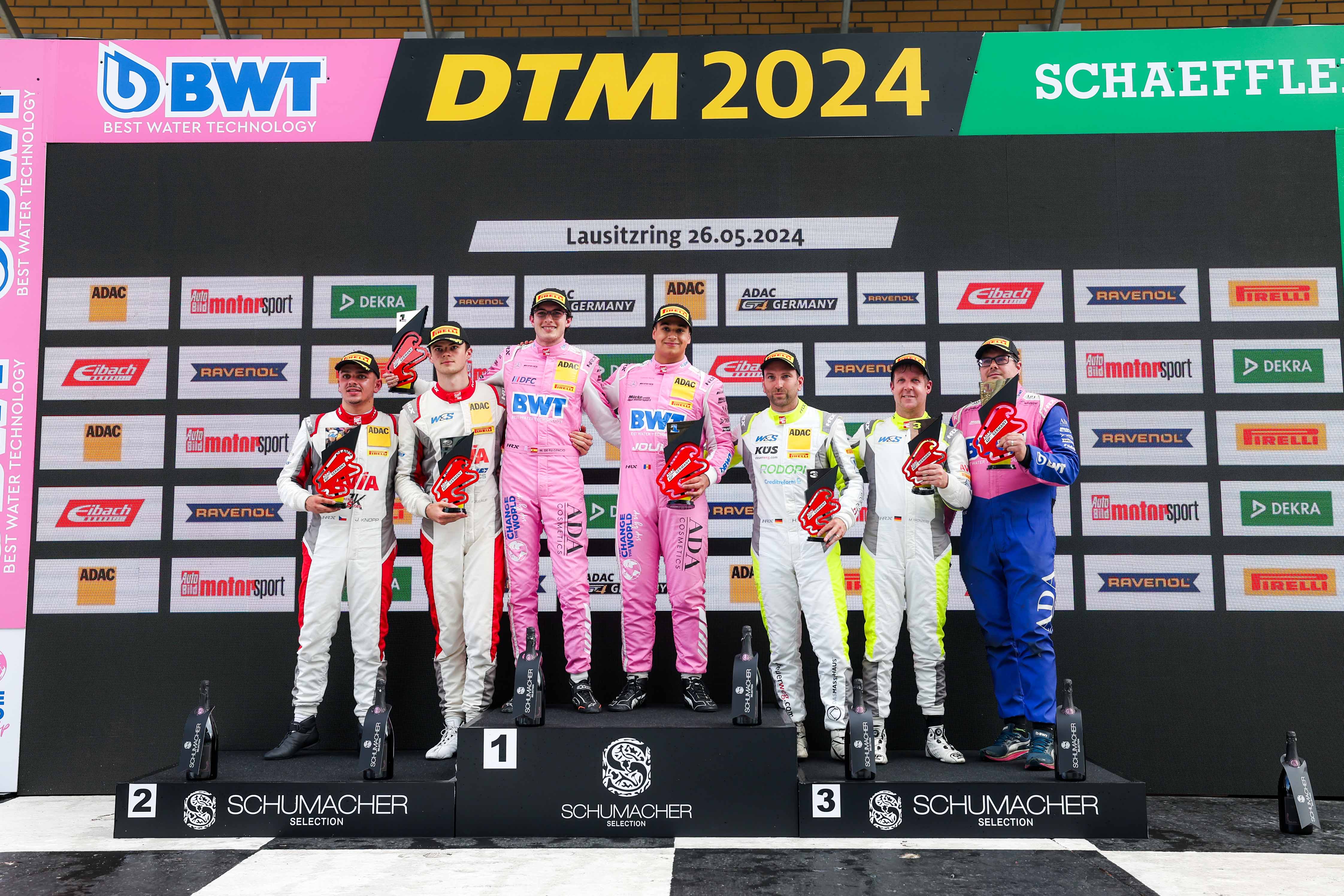 Klettwitz. Regen, Reifenwechsel, wechselnde Führung und neue Sieger. Das Sonntagsrennen der ADAC GT4 Germany auf dem Dekra Lausitzring war ein echtes Motorsport-Fest. Am Ende siegten Enzo Joulié (20/AND) und Marc de Fulgencio (24/ESP) im Mercedes-AMG GT4 von BWT Mücke Motorsport – und feierten nicht nur den ersten Triumph des Berliner Rennstalls in der ADAC GT4 Germany, sondern auch den Heimsieg. Platz zwei ging an Finn Zulauf (19/Königstein im Taunus) und Josef Knopp (20/CZE, beide AVIA W&S Motorsport) im Porsche 718 Cayman GT4 vor deren Teamkollegen Max Kronberg (37/Singapur) und Hendrik Still (36/Kempenich). „Hier auf dem Lausitzring den Heimsieg für BWT Mücke Motorsport klar zu machen, ist etwas ganz Besonderes. Wir werden heute im Team sicherlich ordentlich feiern“, jubelte de Fulgencio.