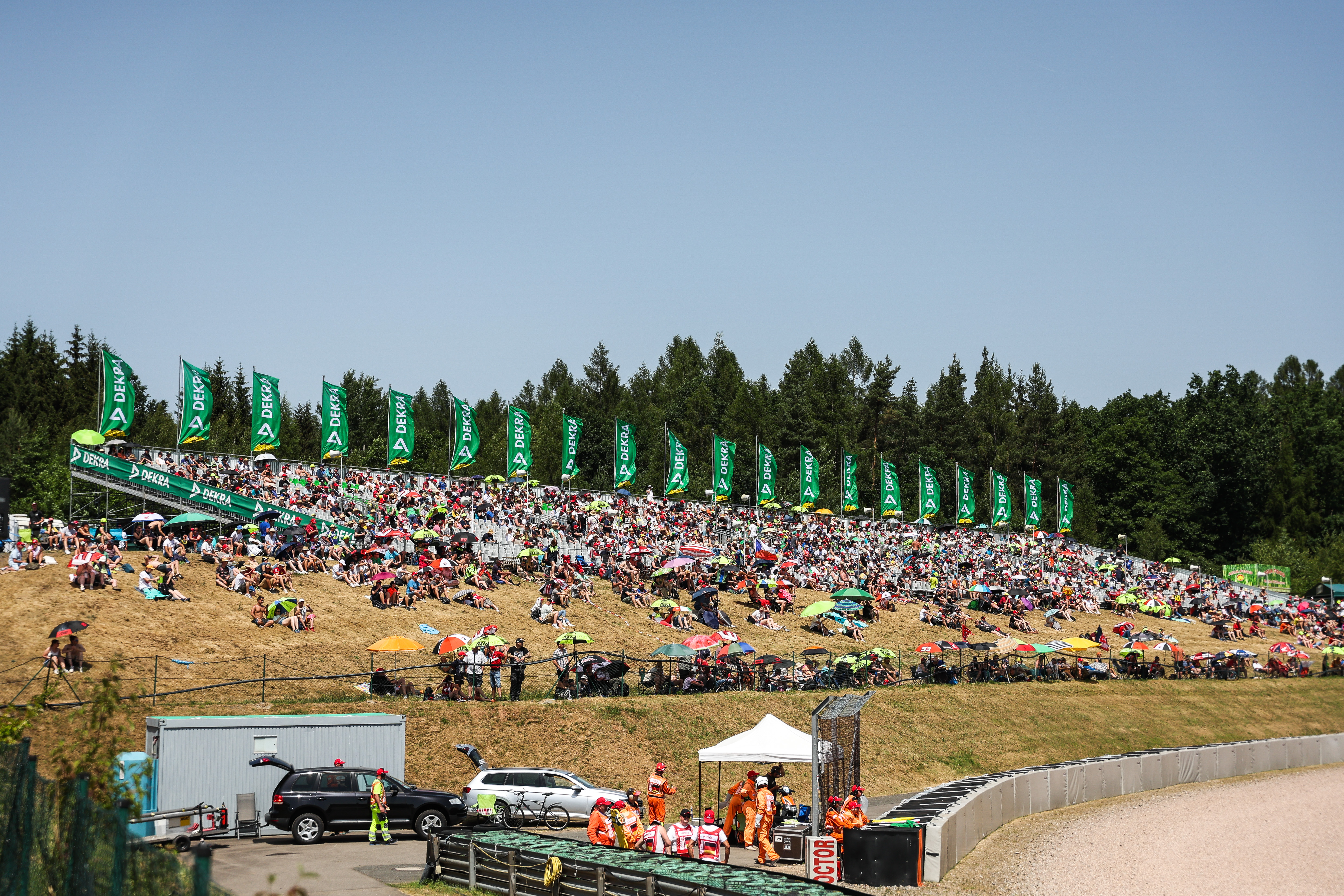 Nicht nur in der Karthalle herrschte beste Stimmung, sondern auch auf der Dekra-Tribüne T13. Zahlreiche Gäste von Dekra erlebten die MotoGP bei einem Event der Sachverständigenorganisation in der Sachsenkurve, darunter auch Guido Kutschera, Vorsitzender der Geschäftsführung der Dekra Automobil GmbH und Jann Fehlauer, Geschäftsführer der Dekra Automobil GmbH.