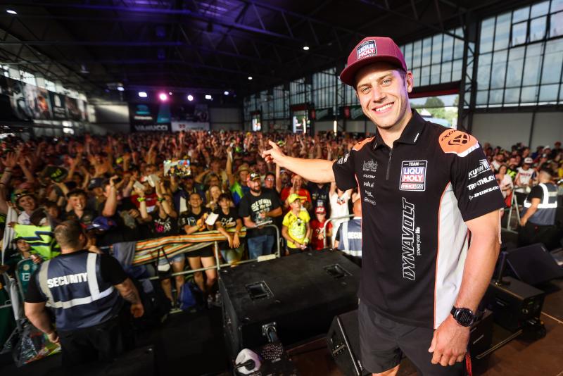 In der Karthalle am Sachsenring wartete auf die Fans wieder das Highlight des Rahmenprogramms: Die traditionelle Fahrerpräsentation am Samstagabend. Die MotoGP-Fahrer Marco Bezzecchi und Remy Gardner ließen sich das Bad in der Menge ebenso wenig entgehen, wie die LIQUI-MOLY-IntactGP-Fahrer aus der Moto2-Klasse, Marcel Schrötter und Jeremy Alcoba. Die Karthalle war bis auf den letzten Platz besetzt und die Stimmung auf dem Siedepunkt.