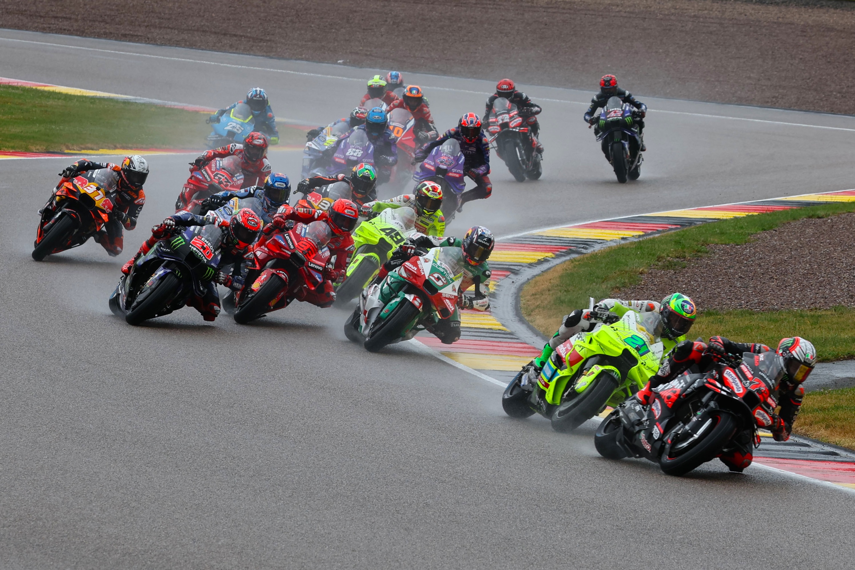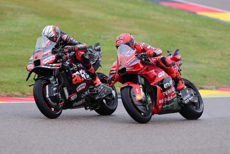 Hohenstein-Ernstthal. Marc Márquez macht seinem Namen als „King of the Ring“ alle Ehre: Der Ducati-Werkspilot holte sich am Samstag den Sieg im Sprint zum Liqui Moly Motorrad Grand Prix Deutschland. Der sechsfache MotoGP-Weltmeister aus Spanien erlebte dabei ein turbulentes Regenrennen auf dem Sachsenring. Nach dem Start verlor der Pole-Setter mehrere Positionen, kämpfte sich aber Schritt für Schritt weiter nach vorn und setzte in der letzten Runde das entscheidende Überholmanöver zum Sieg.