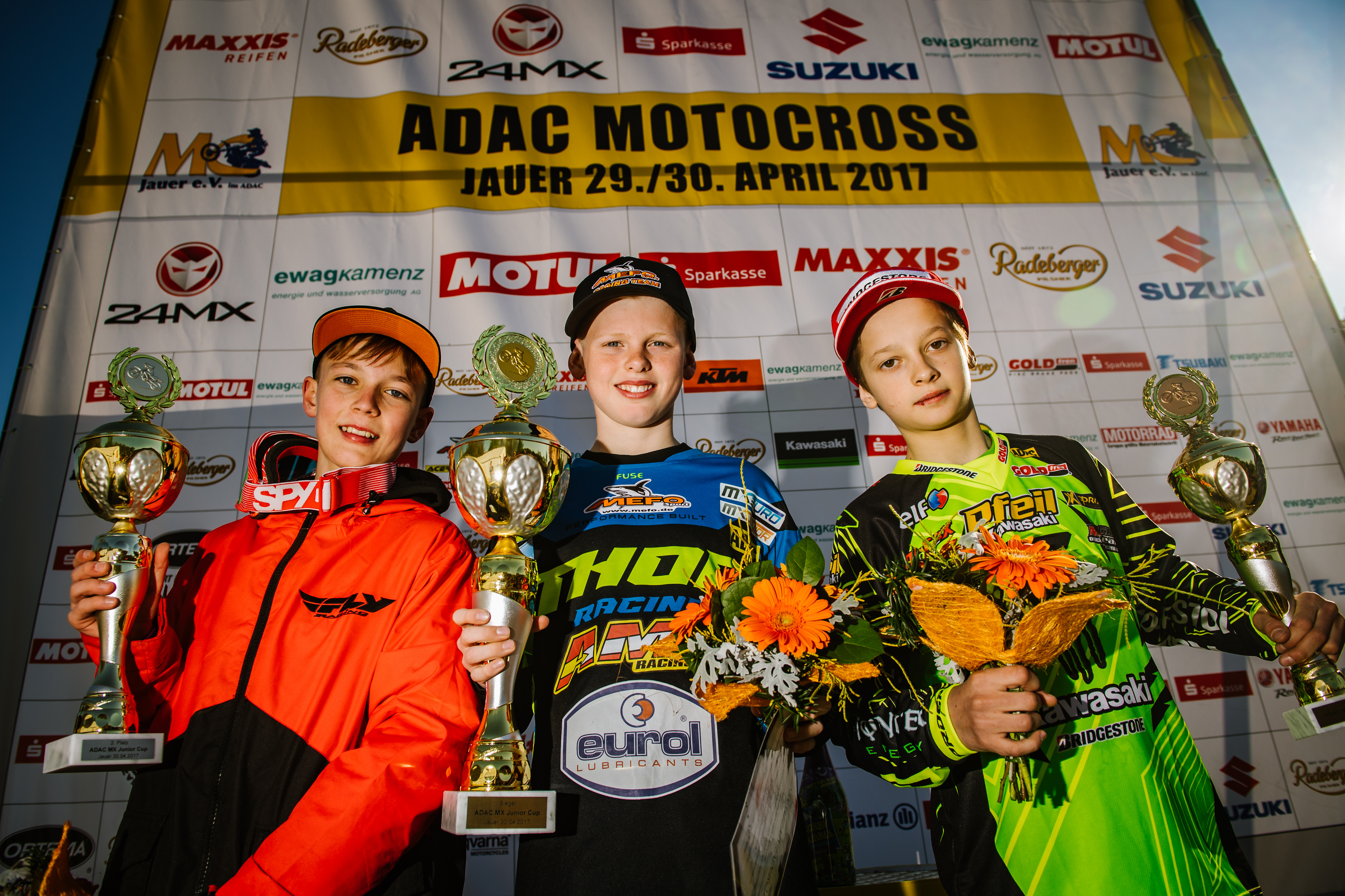 ADAC MX Masters, Jauer, Siegerehrung beim ADAC MX Junior Cup, Constantin Piller (MSC Freisinger Bär ), Magnus Smith (MEFO Sport Racing Team ) und Nikita Kucherov (Monster Energy Kawasaki Elf Team Pfeil )