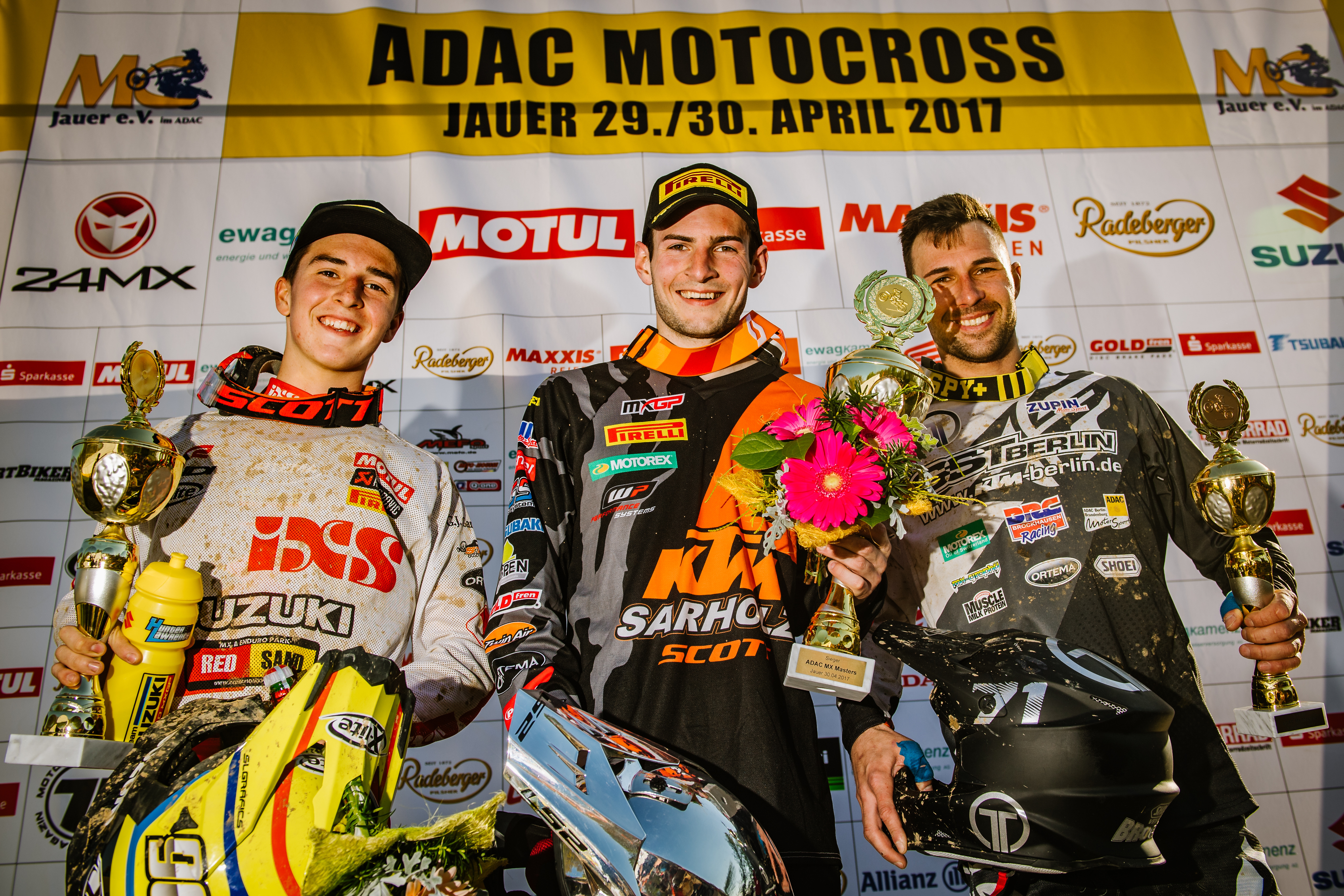 ADAC MX Masters, Jauer, Siegerehrung beim ADAC MX Masters, Hunter Lawrence (Team Suzuki World MX2 ), Dennis Ullrich (KTM Sarholz Racing Team ) und Christian Brockel (KTM GST Berlin )