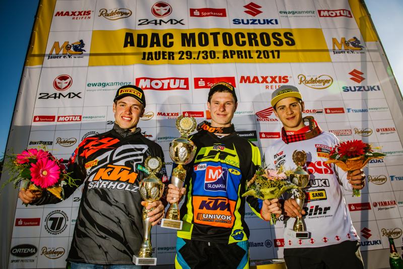 ADAC MX Masters, Jauer, Siegerehrung beim ADAC MX Youngster Cup v.l.n.r.: Tom Koch ( Deutschland / KTM / KTM Sarholz Racing Team ), Richard Sikyna ( Slowakei / KTM / MX Slovakia ) und Zachary Pichon ( Frankreich / Suzuki / Team Suzuki World MX2 )
