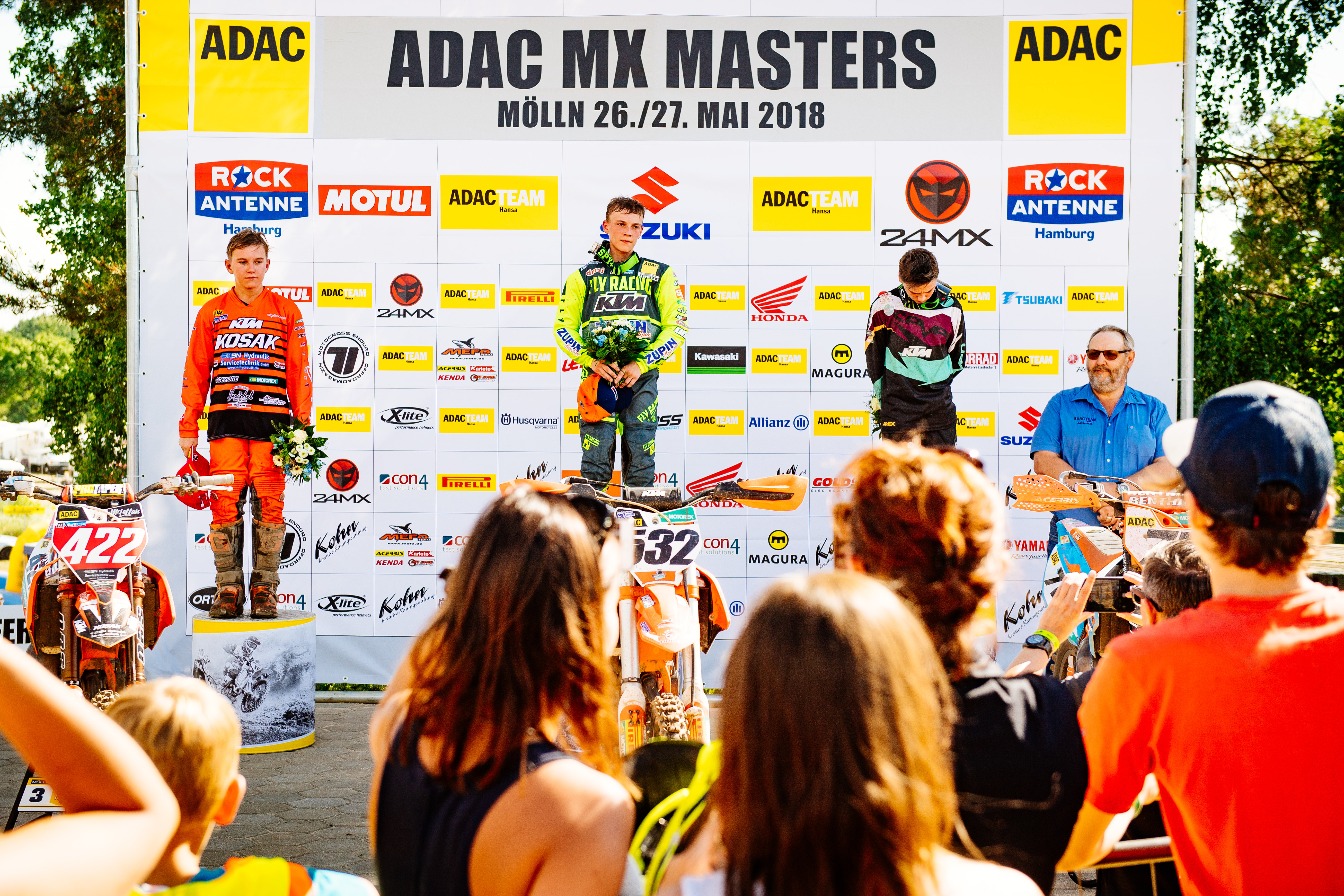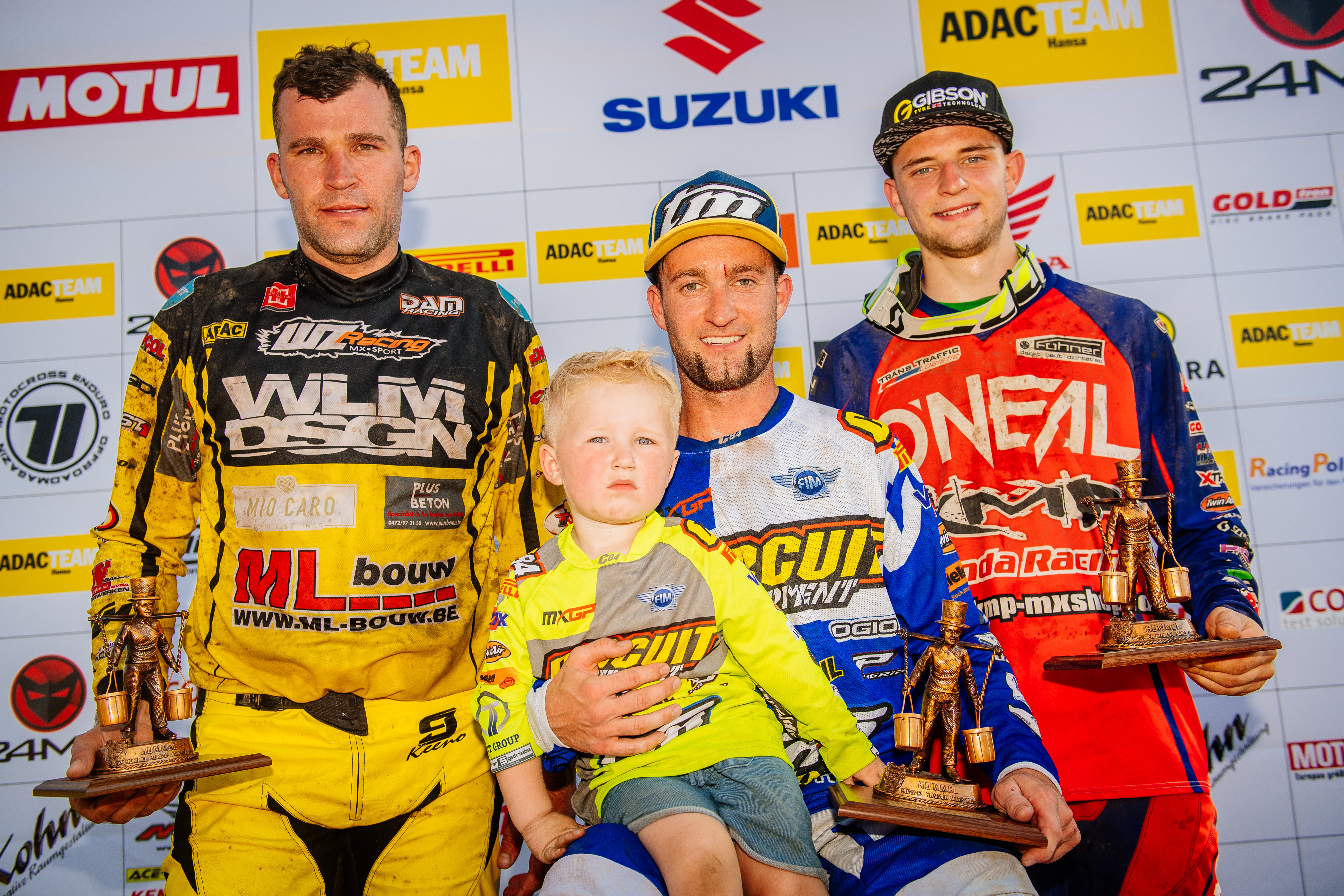 ADAC MX Masters Mölln Tagessiegerehrung beim ADAC MX Masters v.l.n.r.: Ken De Dycker ( Belgien / KTM / WZ-Racing ), Maximilian Nagl ( Deutschland / TM / TM Factory Racing ) mit seinem Sohn Mason und Nathan Renkens ( Belgien / Honda / KMP-Honda-Racing )