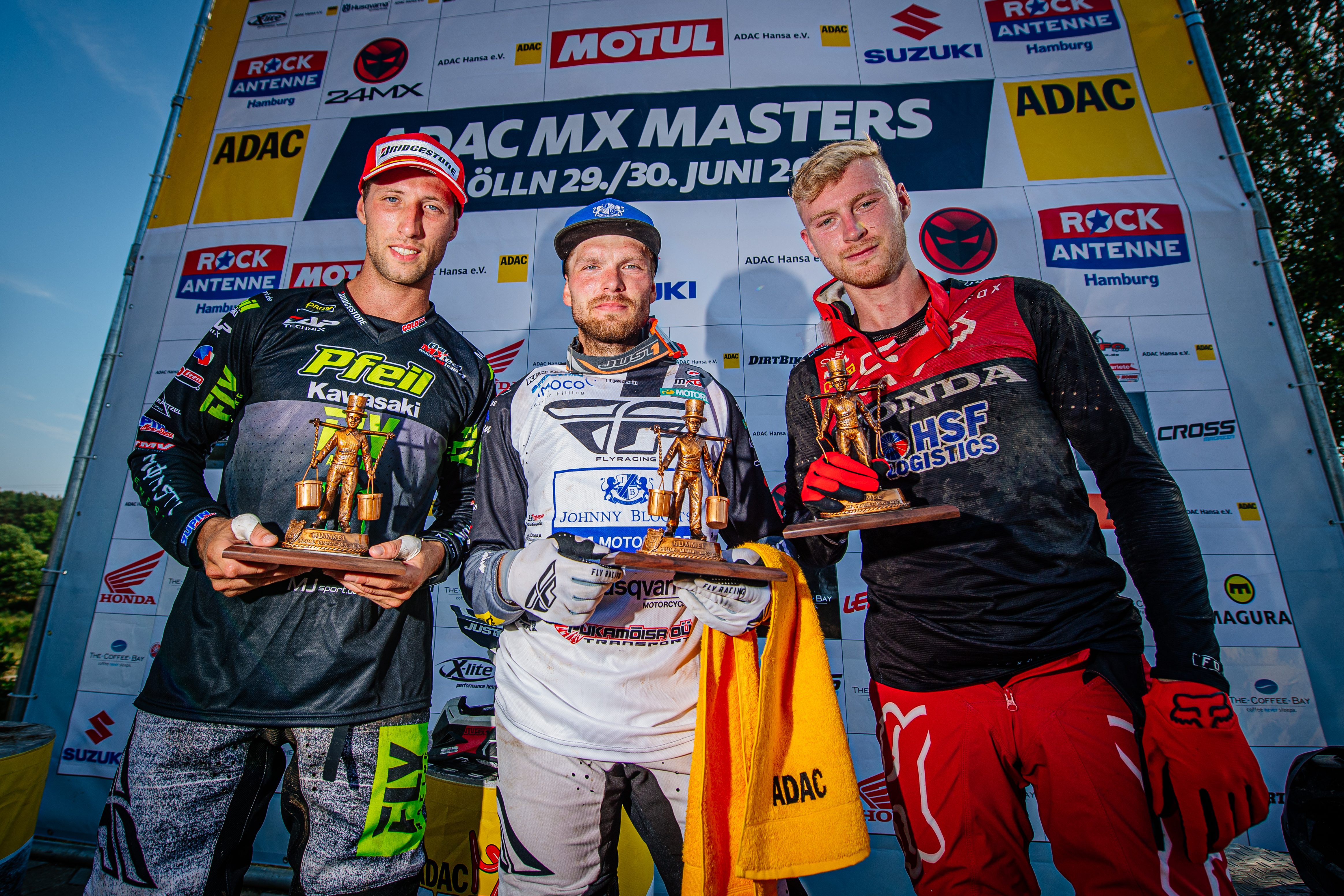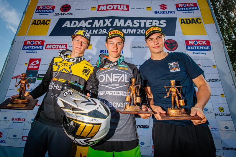 ADAC MX Masters 2019 , ADAC MX Masters Mölln, Siegerehrung beim ADAC MX Masters v.l.n.r.: Jens Gettemann ( Belgien / Kawasaki / Monster Energy Kawasaki Elf Team Pfeil ), Tanel Leok ( Estland / Husqvarna / A1M Husqvarna ) und Calvin Vlaanderen ( Niederlande / Honda / HRC Honda MX2 )