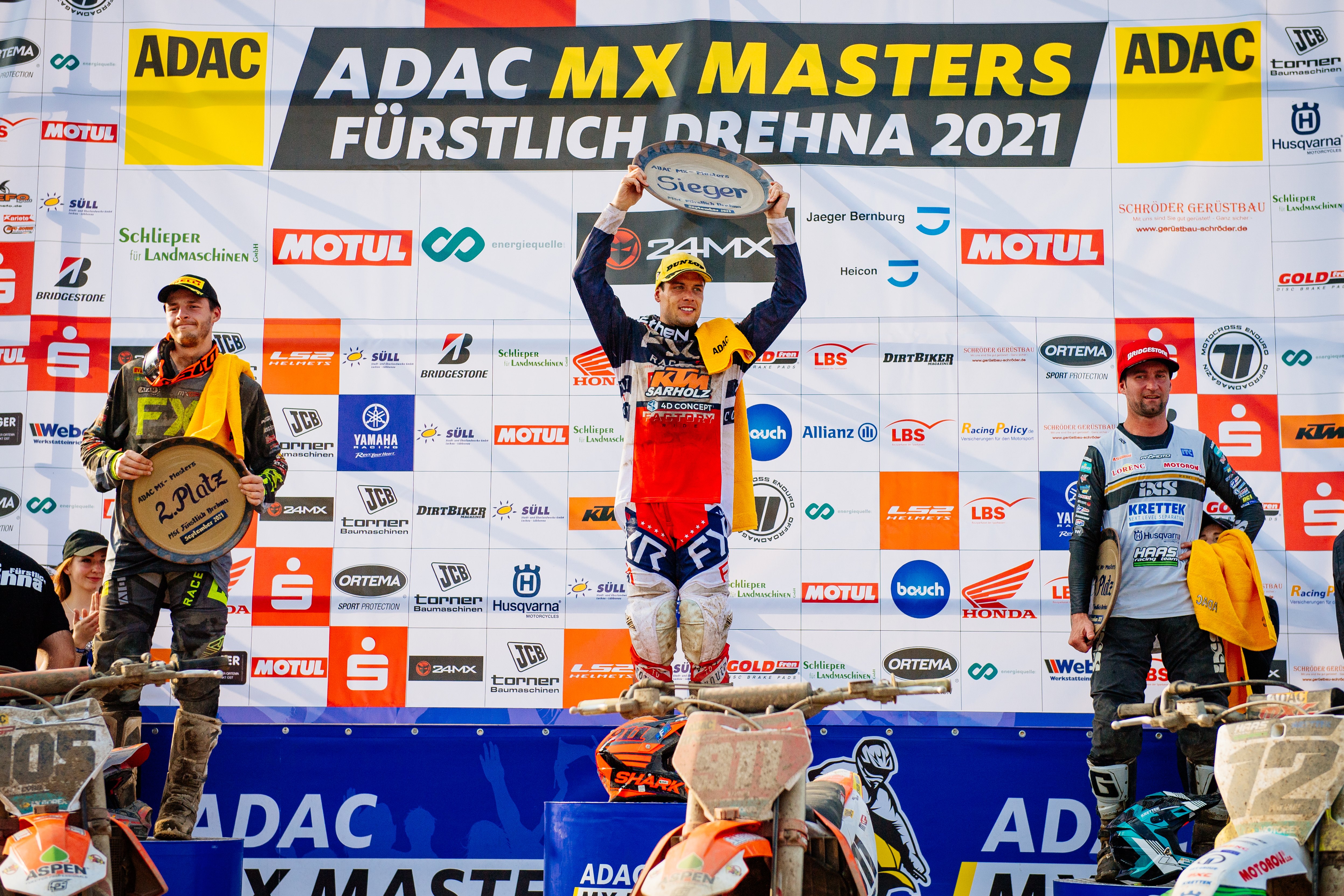 Tageswertung v.l.n.r.: Cyril Genot ( Belgien / KTM / KTM Sarholz Racing Team ), Jordi Tixier ( Frankreich / KTM / KTM Sarholz Racing Team ) und Maximilian Nagl ( Deutschland / Husqvarna / Krettek-Haas-Racing-Team ) beim ADAC MX Masters