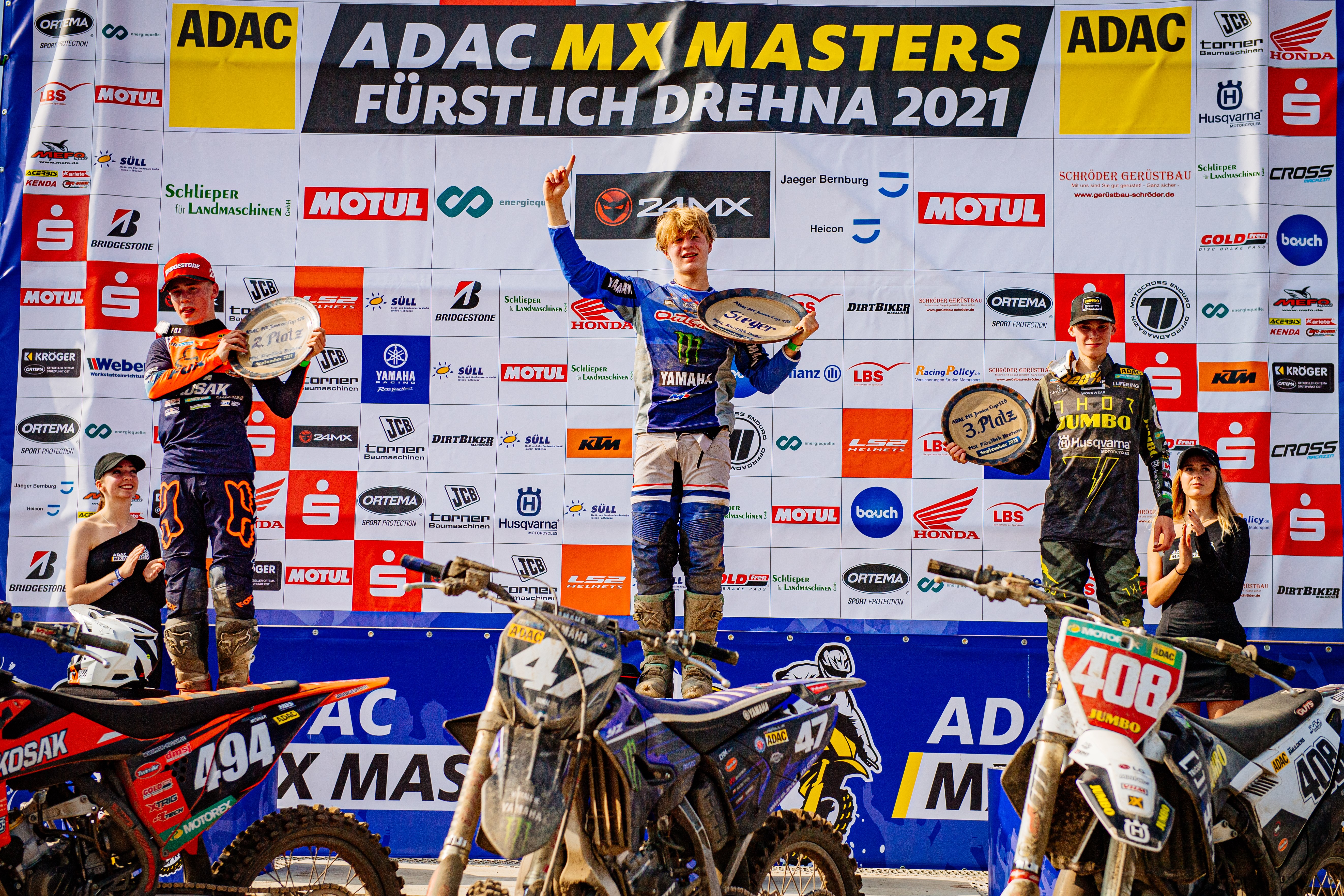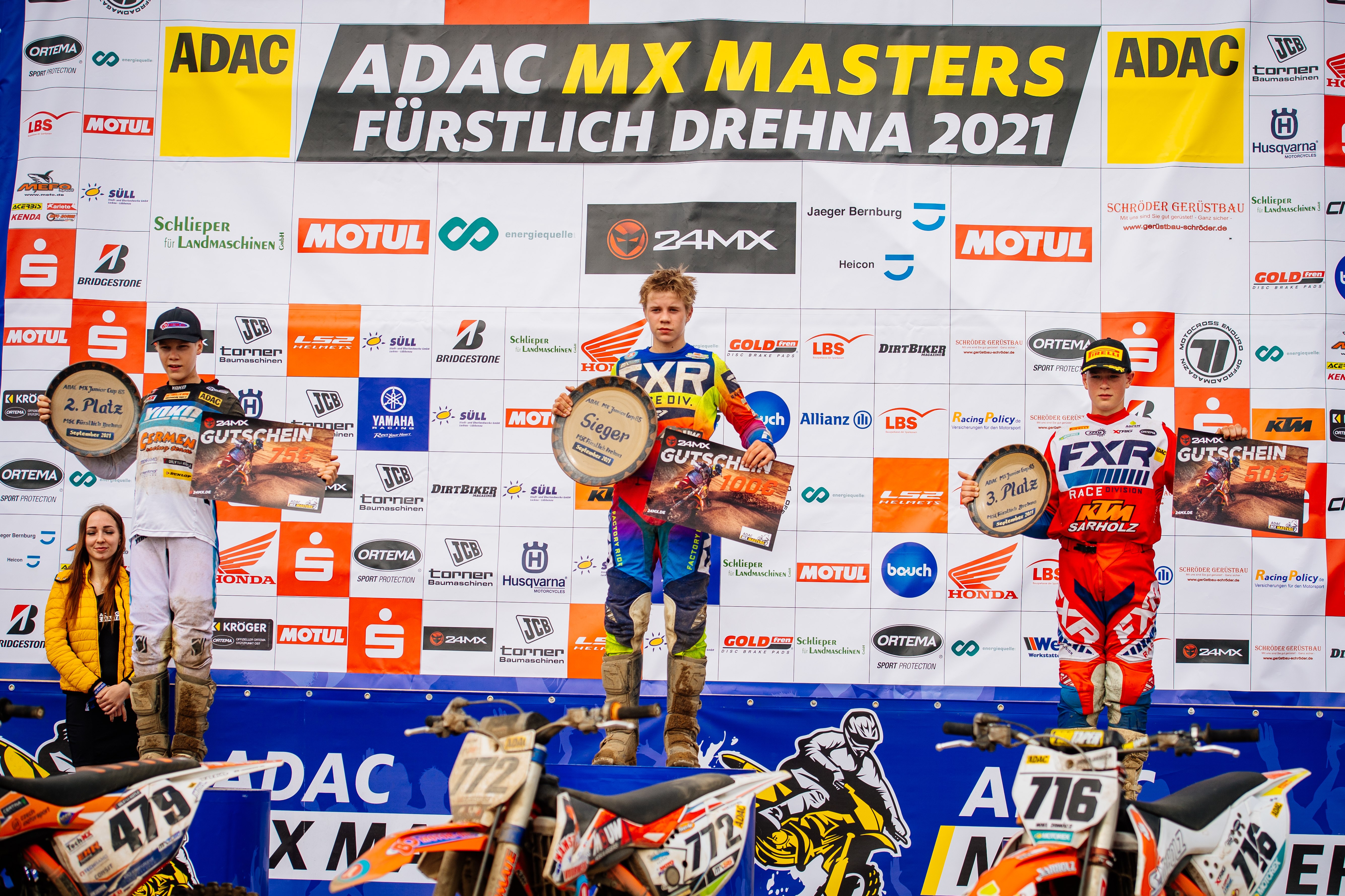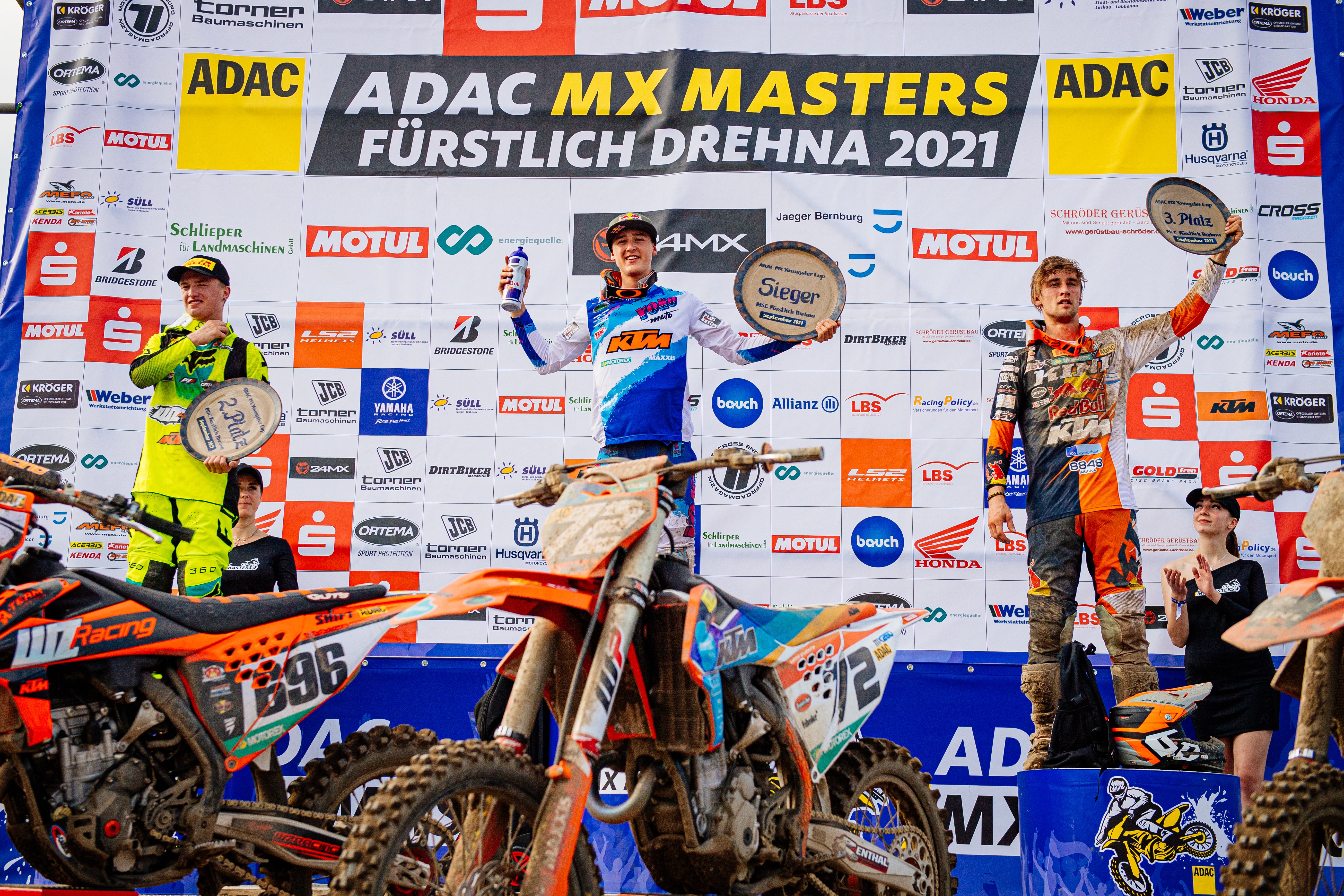 Tageswertung beim ADAC MX Junior Cup 125ccm v.l.n.r.: Maximilian Werner ( Deutschland / KTM / Kosak Racing Team ), Karlis Alberts Reisulis ( Lettland / Yamaha / Yamaha Europe MX125 MJC ) und Scott Smulders ( Niederlande / Husqvarna / No Fear-JUMBO-BT Racing Team )