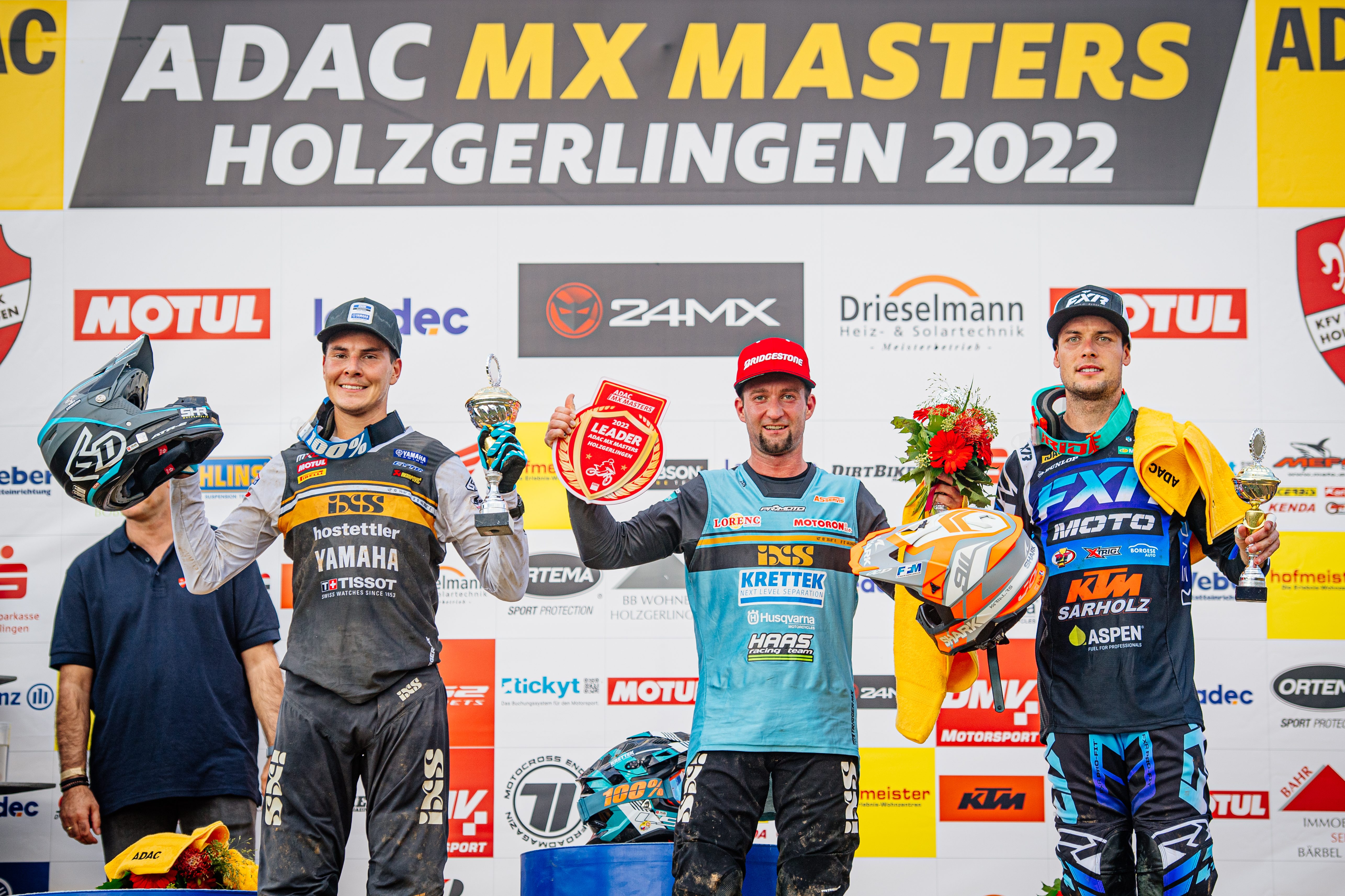 Das ADAC MX Masters Gesamt-Podium in Holzgerlingen (v.l.): Valentin Guillod, Max Nagl und Jordi Tixier