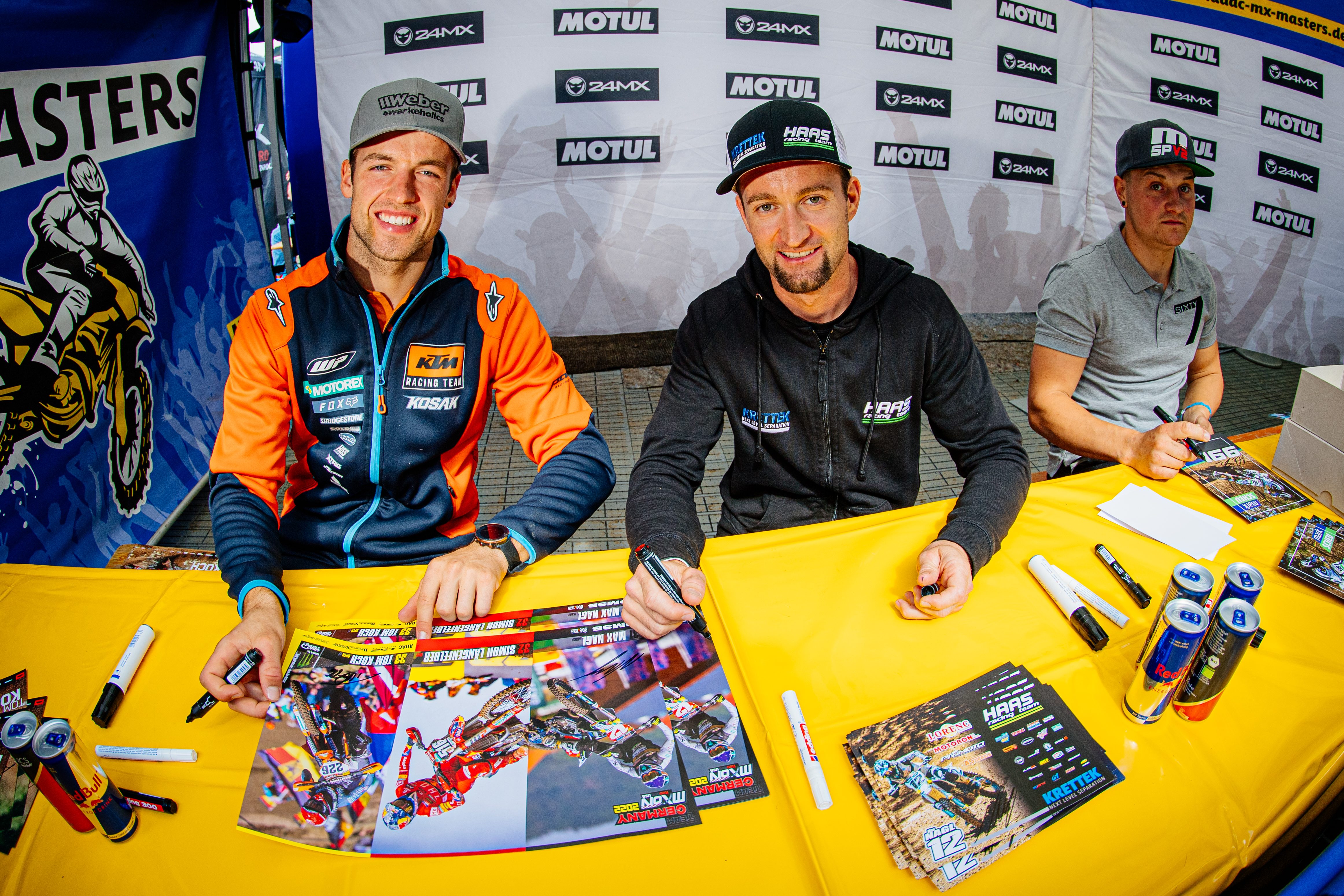 Tom Koch ( Deutschland / KTM / Kosak Racing Team ), Maximilian Nagl ( Deutschland / Husqvarna / Krettek-Haas-Racing-Team ) und Mark Scheu ( Deutschland / Husqvarna / SixtySeven ) schreiben Autogramme beim ADAC MX Masters