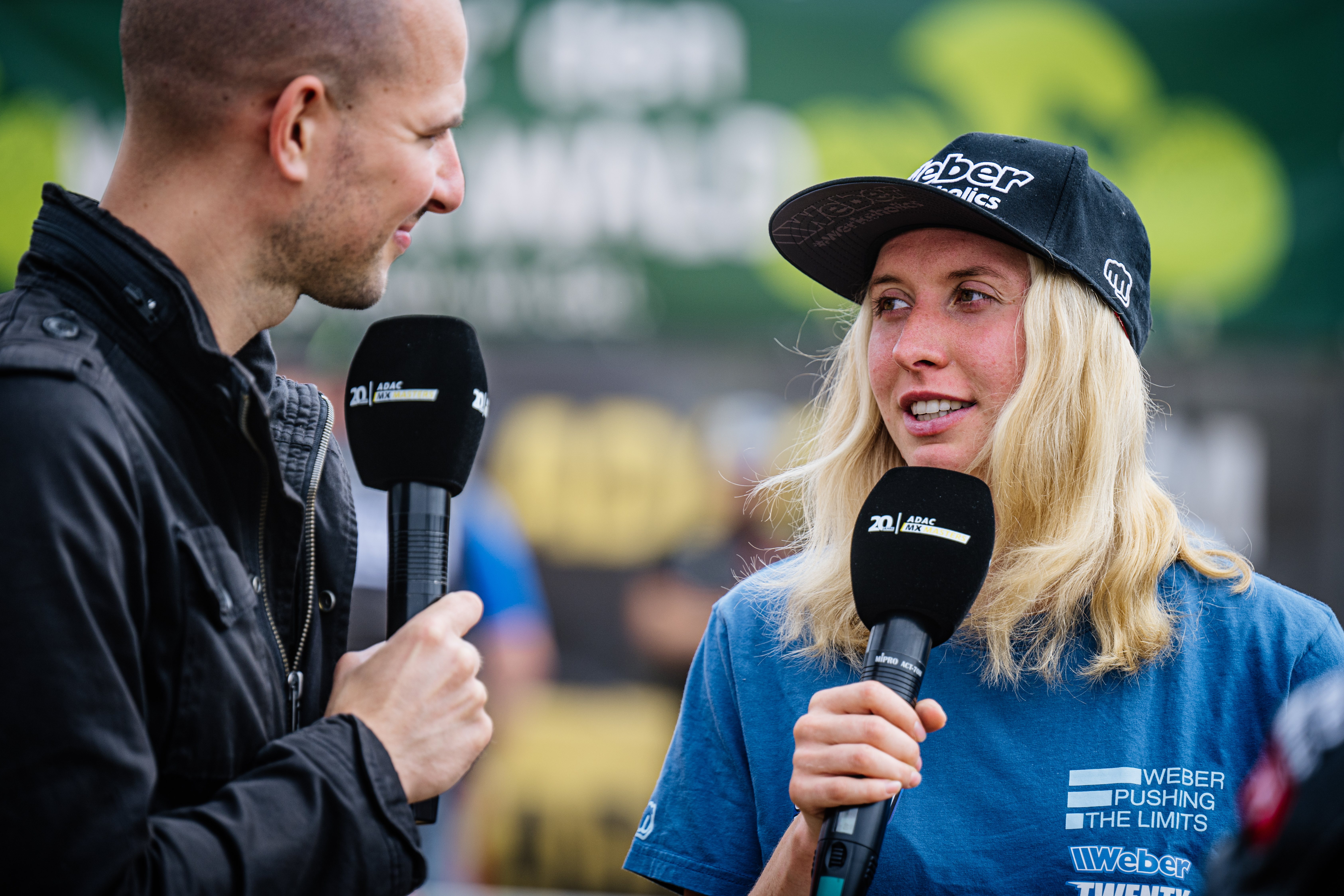 Moderator Lukas Gajewski im Interview mit Fiona Hoppe ( Deutschland / Husqvarna ) beim Finallauf der EMX Women