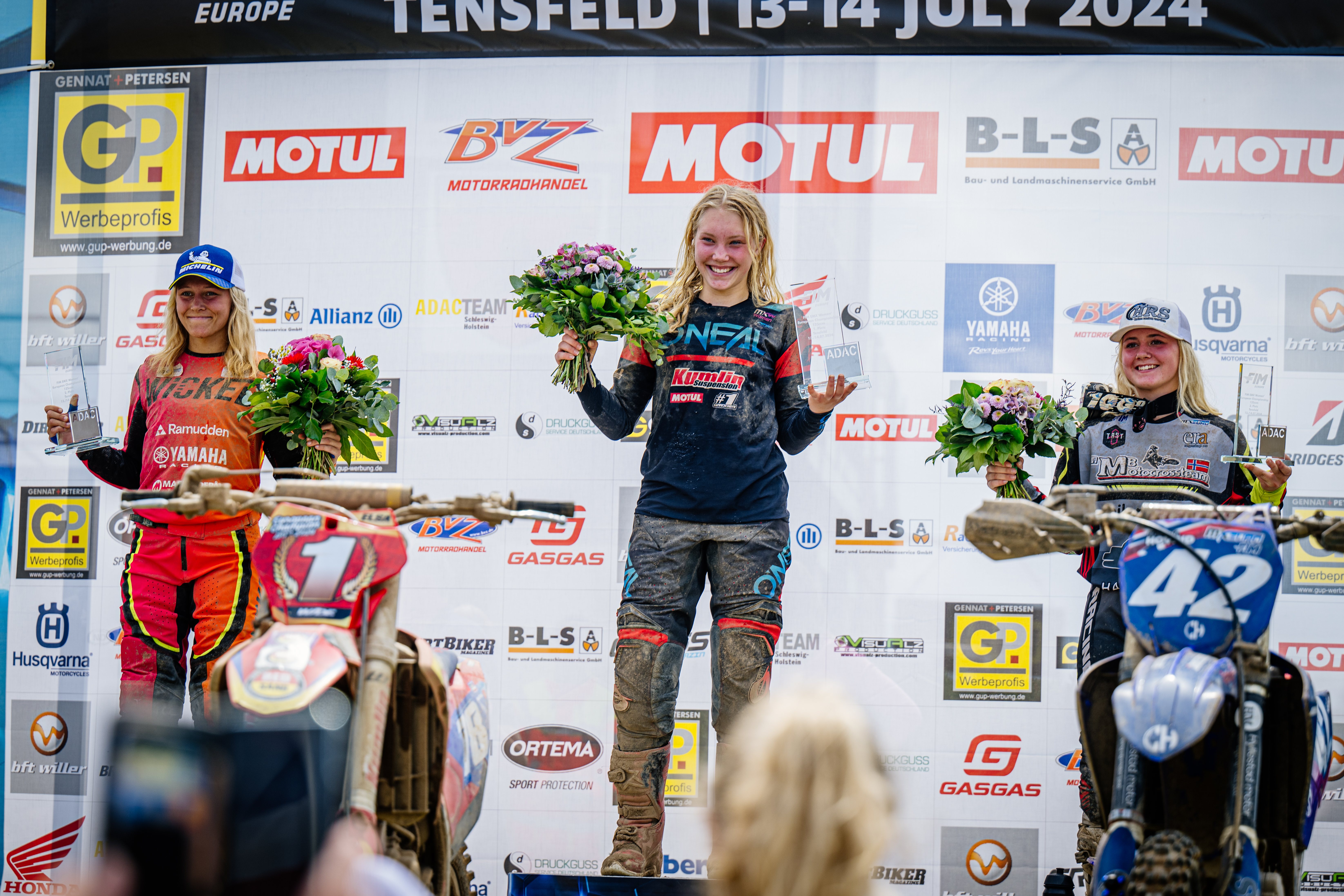 Tageswertung beim EMX Women Final 125 v.l.n.r.: Nellie Fransson ( Schweden / Yamaha ), Elsa Andersson-Lof ( Schweden / KTM ) und Rosalita Hovind ( Norwegen / Yamaha )