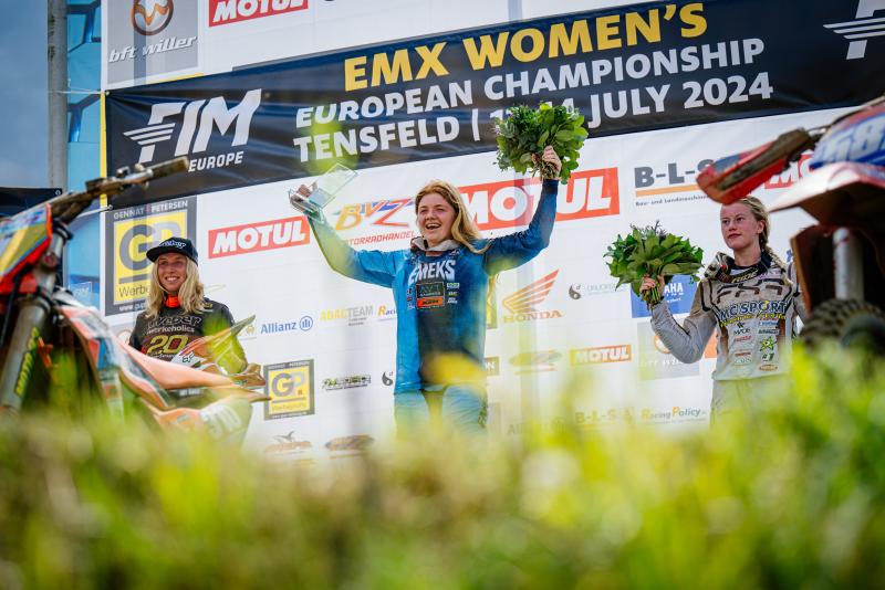 Das Podium der EMX Women in Tensfeld (v. l.): Fiona Hoppe, Lucy Barker, Tyra Bäckström