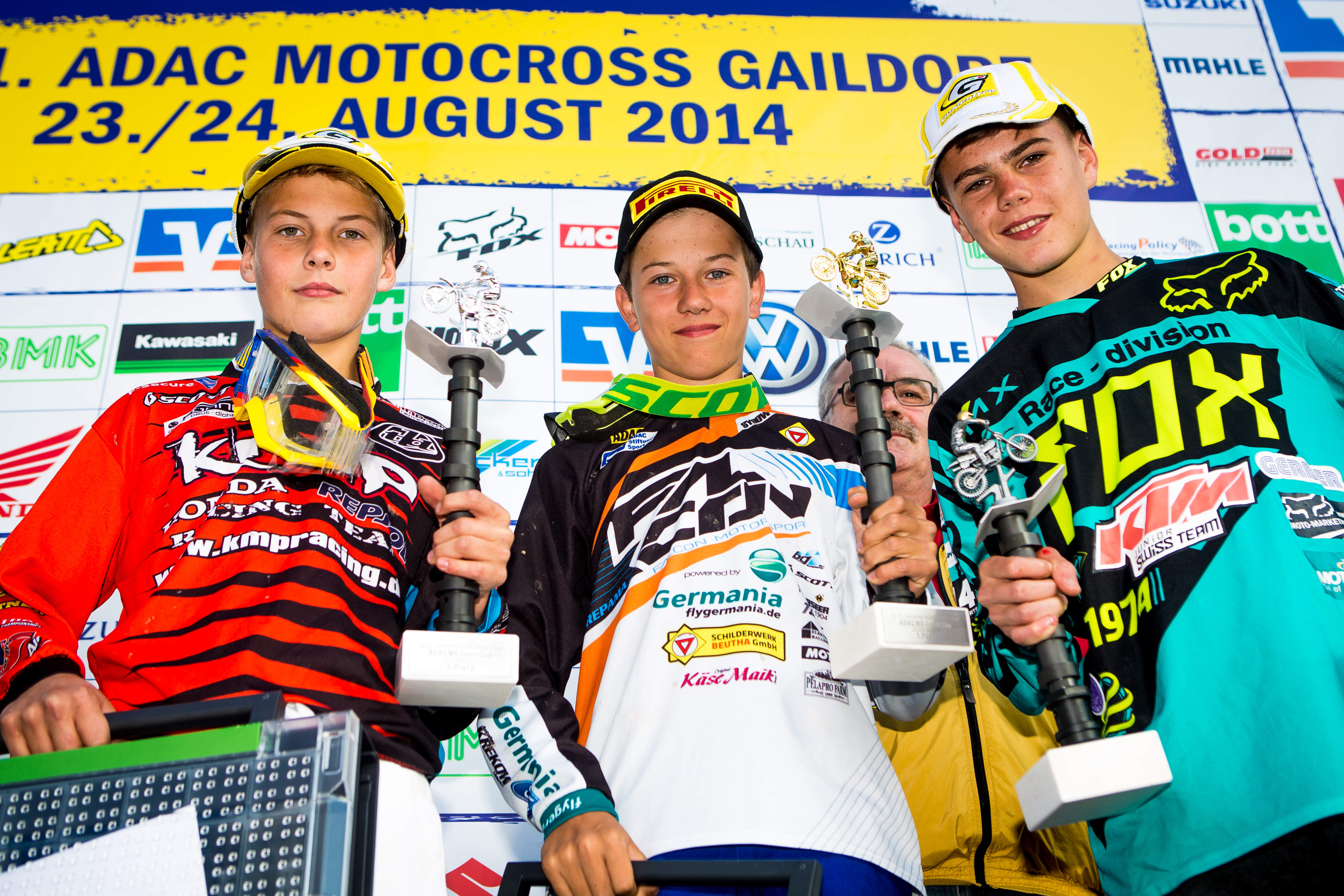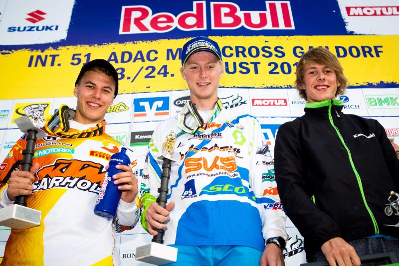 ADAC MX Masters, Gaildorf, ADAC MX Youngster Cup, Siegerehrung v.l.n.r.: Henry Jacobi ( KTM / Deutschland ), Calvin Vlaanderen ( KTM / Niederlande ) und Luca Nijenhuis ( Kawasaki / Niederlande )