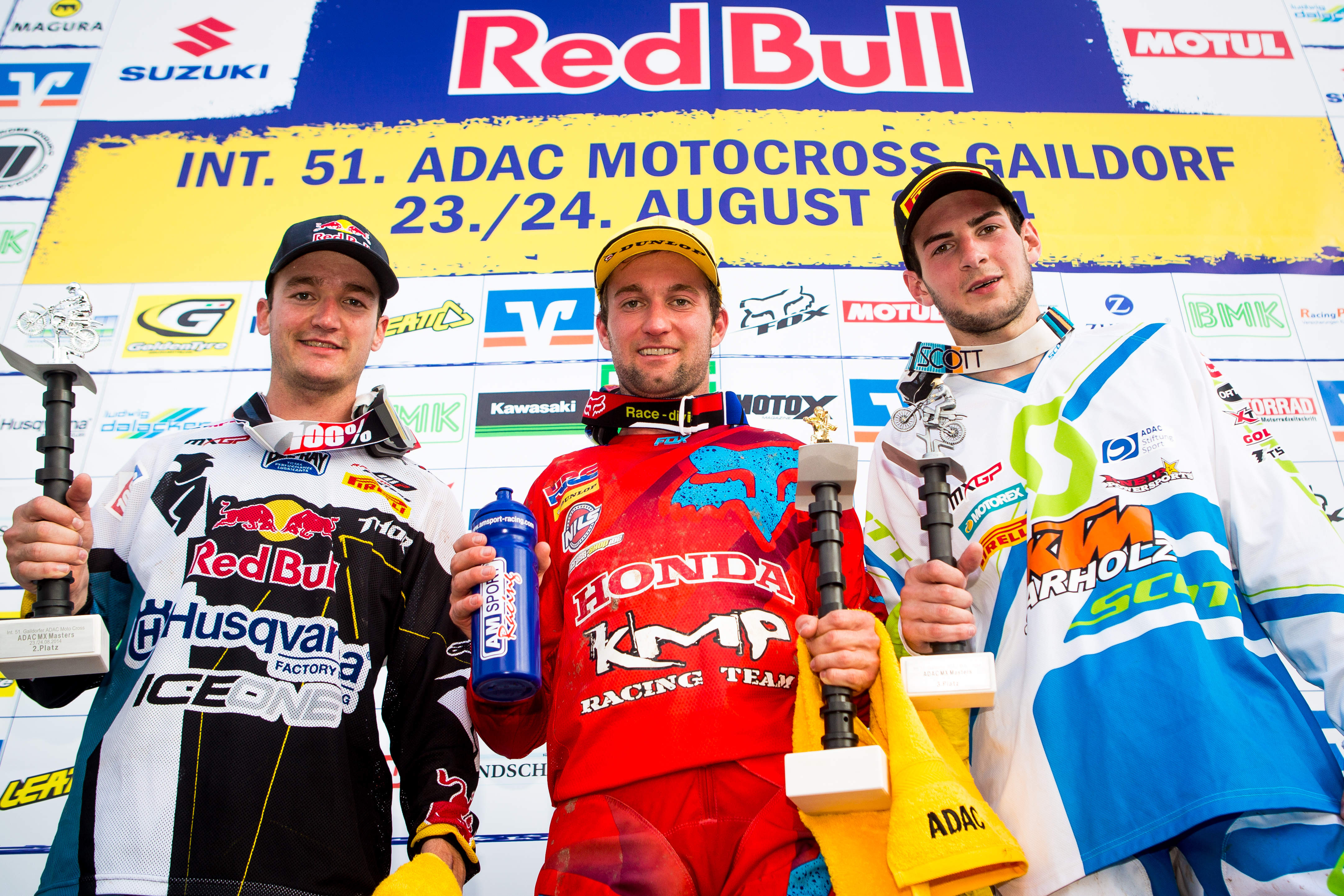 ADAC MX Masters, Gaildorf, Siegerehrung v.l.n.r.: Dean Ferris ( Husqvarna / Australien ), Maximilian Nagl ( Honda / Deutschland ) und Dennis Ullrich ( KTM / Deutschland )