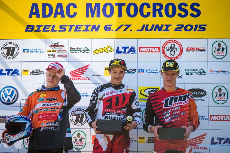 ADAC MX Masters, Bielstein, Siegerehrung des ADAC MX Youngster Cup, Stefan Ekerold ( KTM / Deutschland ), Brian Hsu ( Suzuki / Deutschland ) und Nicholas Adams ( KTM / Großbritannien )