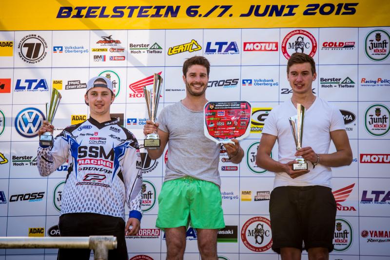 ADAC MX Masters, Bielstein, Siegerehrung im 2-Takt Cup, Marvin Heyner ( Deutschland / Honda ), Christian Herzberg ( Deutschland / Yamaha ) und Marco Hummel ( Deutschland / Husqvarna )