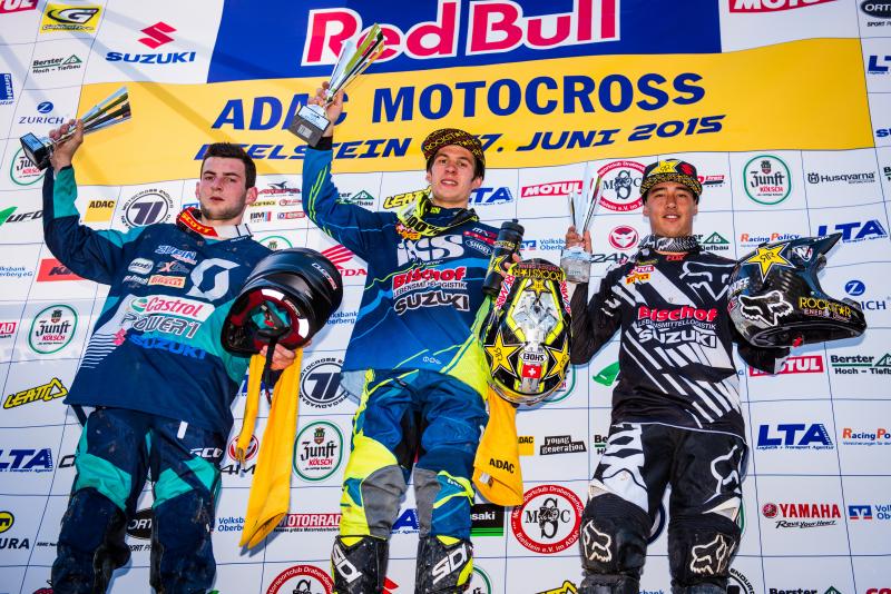 ADAC MX Masters, Bielstein, Siegerehrung, Dennis Ullrich ( Suzuki / Deutschland ), Jeremy Seewer ( Suzuki / Schweiz ) und Glenn Coldenhoff ( Suzuki / Niederlande )