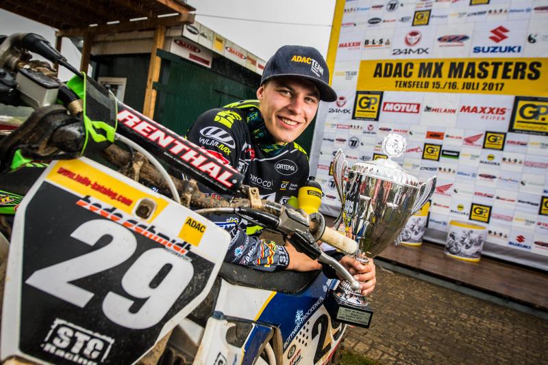 Den schönsten Gänsehaut-Moment gab es beim 100. ADAC MX Masters-Event in Tensfeld beim ADAC MX Youngster Cup. Der Mönchengladbacher Lukas Platt (21, DW Racing Team, KTM), der im ersten Lauf bereits durch einen guten Start und einen soliden neunten Platz für Aufmerksamkeit gesorgt hatte, fuhr im zweiten Lauf wie von einem anderen Stern und sicherte sich damit am Ende nicht nur den Lauf-, sondern auch den Tagessieg. Ein Ergebnis, das den gelernten Tischler aus Mönchengladbach sehr emotional werden ließ. „Das ist mein erstes Podium bei dieser Rennserie, ich kann das gerade noch gar nicht richtig fassen. Ich bin zwar schon eher ein Sandspezialist und fahrerisch gesehen ein halber Niederländer, allerdings hätte ich so einen Auftritt nie erwartet. Ich war direkt Zweiter nach dem Start und dachte mir, dass das meine große Chance ist. Also habe ich Gas gegeben und gerade in den letzten drei Runden nur noch darauf geachtet, nicht runterzufallen. Ich freue mich so!“, kommentierte der 21-Jährige, der zuletzt in 2012 als Gewinner des ADAC Bundesendlaufs gepunktet hatte. Besonders motivierend: Sein Team hatte Platt versprochen, ihm ein neues Motorrad zu spendieren, sollte ihm der Tagessieg in Tensfeld gelingen. Als Gesamtzweiter beim Event in Tensfeld bekam der Meisterschaftsführende Tom Koch (19, KTM Sarholz Racing Team) einen Pokal überreicht, Gesamtdritter wurde der Pole Gabriel Chetnicki (18, JWD / Ferrotherm Racing, KTM).