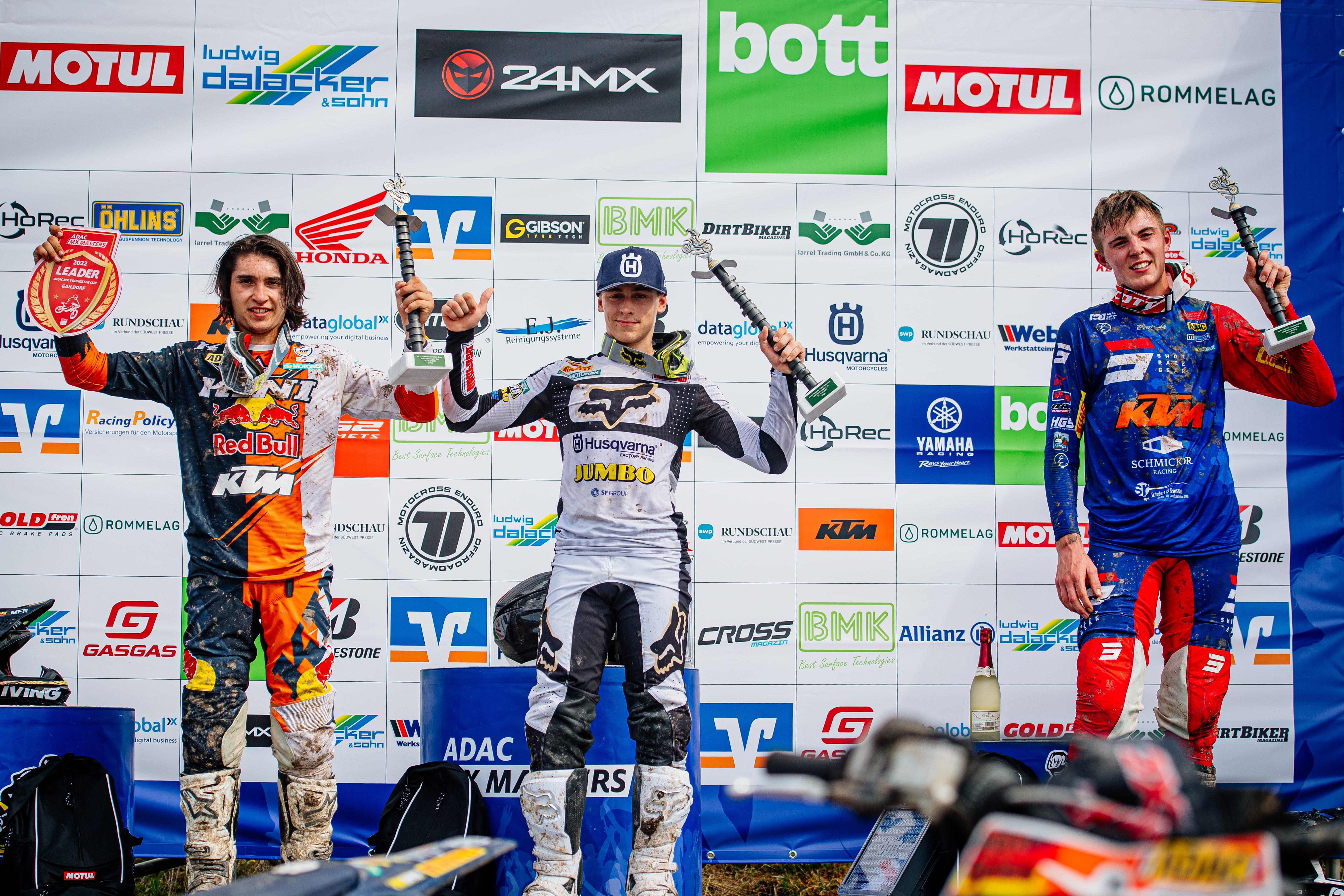 Die Fans in Gaildorf erlebten drei spannende Rennen im ADAC MX Junior Cup 125, bei denen gleich mehrerer Fahrer das Tempo für den Sieg zeigten. Nach drei Wertungsläufen stand der LS2 Best Qualifier Marc-Antoine Rossi (F/Sturm STC Racing) mit einem zweiten Platz und zwei Laufsiegen auf der obersten Stufe des Podiums. Rossi fuhr in Gaildorf auf einem Vorserienmodell der KTM 125 SX des kommenden Baujahres. Der Franzose musste sich lediglich im ersten Lauf dem erst 14-jährigen Janis Martins Reisulis (EST/Hamstra MX Team) geschlagen geben. Der wurde mit einem Laufsieg sowie einem vierten und zweiten Platz in der Gesamtwertung Zweiter. Der Meisterschaftsführende Ivano Van Erp (NL/SHR Motorsports) kämpfte nicht nur mit den Gegnern, sondern auch mit Magenproblemen. Dennoch zeigte er gute Rennen und lag im dritten Lauf sogar in Führung, bis er im Zweikampf mit Rossi zu Boden ging. Mit den Positionen drei, zwei und drei landete er auf dem dritten Gesamtrang und verlor in der Meisterschaft lediglich drei Punkte Vorsprung auf Reisulis. Karlis Alberts Reisulis (EST/Yamaha MJC) fuhr den Red Bull Holeshot im ersten Lauf ein, ging dann jedoch im Rennverlauf zu Boden. Der ältere Reisulis-Bruder beendete mit den Laufergebnissen neun, drei und fünf das Wochenende auf dem vierten Rang vor dem amtierenden ADAC MX Junior Cup 85-Champion Vitaszlav Marek (CZ), der die Gesamt-Top-Fünf mit den Rängen fünf, zehn und vier abrundete. In der Meisterschaft führt Van Erp vor Janis Martins Reisulis, Marek, Julius Mikula (CZ) und Karlis Alberts Reisulis.