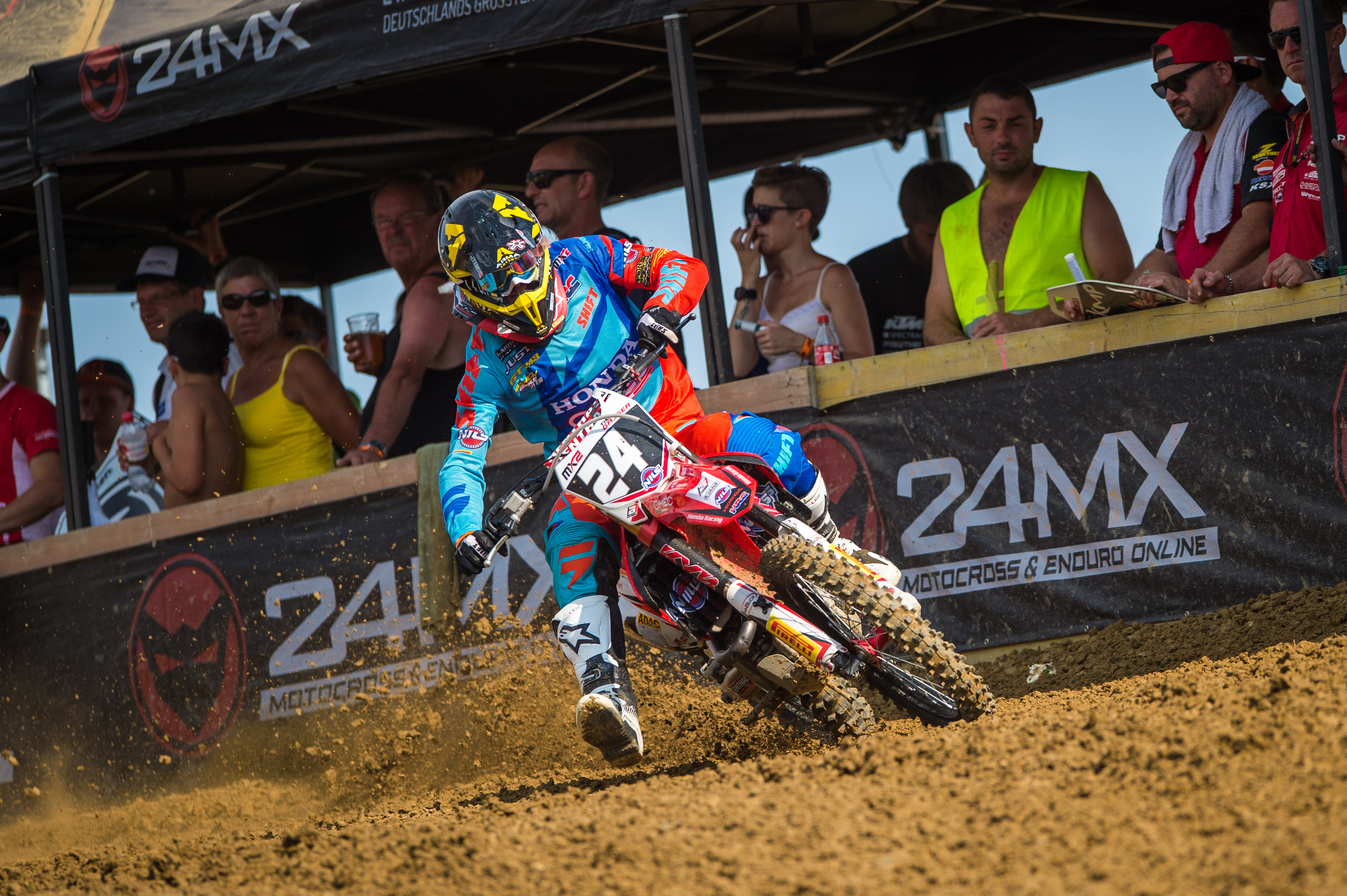 Ried im Innkreis. Strahlender Sonnenschein, anspruchsvoller Lehmboden und ein hochkarätiges Starterfeld zeichneten ein optimales Rennwochenende des ADAC MX Masters im österreichischen Ried im Innkreis (Mehrndorf) aus. Auf der 1.900 Meter langen Naturrennstrecke auf dem Truppenübungsplatz des österreichischen Bundesheeres kämpften die Fahrer um entscheidende Punkte, denn nach sechs von acht Veranstaltungen rückt die Titelvergabe und die Ausschüttung von insgesamt 260.000 Euro Preisgeld immer näher. Vor den Augen von 8.000 Zuschauern am Wochenende erkämpfte sich der MX2-WM-Pilot Tim Gajser (Honda Gariboldi) aus Slowenien eindrucksvoll in beiden Läufen Platz eins und holte sich somit den Tagessieg in Europas beliebtester Motocross-Serie.