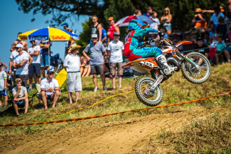 Spitzenreiter im ADAC MX Junior Cup war an diesem Wochenende Jeremy Sydow (KTM/Falcon Motorsports) aus Chemnitz. Der 15-Jährige gewann die Tageswertung mit einem Sieg im ersten Rennen und dem zweiten Platz in Rennen zwei. „Ich war aufgeregt vor dem heutigen Renntag, weil die Titelentscheidung immer näher rückt“, sagte Sydow, dem bereits zum zweiten Mal der Sieg bei den Fahrern von zehn bis 15 Jahren gelang. Dahinter profitierte der Oberösterreicher René Hofer (13/MSC Imbach/KINI KTM Junior Pro Team) aus dem 98 Kilometer entfernten Alberndorf von seinem Heimvorteil und belegte unter tosendem Applaus Platz zwei. Titelverteidiger und Meisterschaftsführender Mikkel Haarup (13/KTM Kosak Racing Team) aus Dänemark wurde im ersten Lauf wegen Vorteilsnahme fünf Plätze nach hinten versetzt, weil er eine geschwenkte gelbe Flagge missachtete und überholte. Im zweiten Lauf gewann er, konnte sich aber in der Tageswertung nur auf Platz drei retten. Auf die Meisterschaftsrangfolge hat das Tagesergebnis keine Auswirkungen. Jedoch kann Sydow seinen Abstand auf den Führenden Haarup (184 Punkte) auf zehn Zähler (174 Punkte) verringern. Als Dritter reiht sich der tschechische KTM-Pilot Petr Polak (14/MEFO Sport Racing Team) mit einem Punktekonto von 144 dahinter ein.