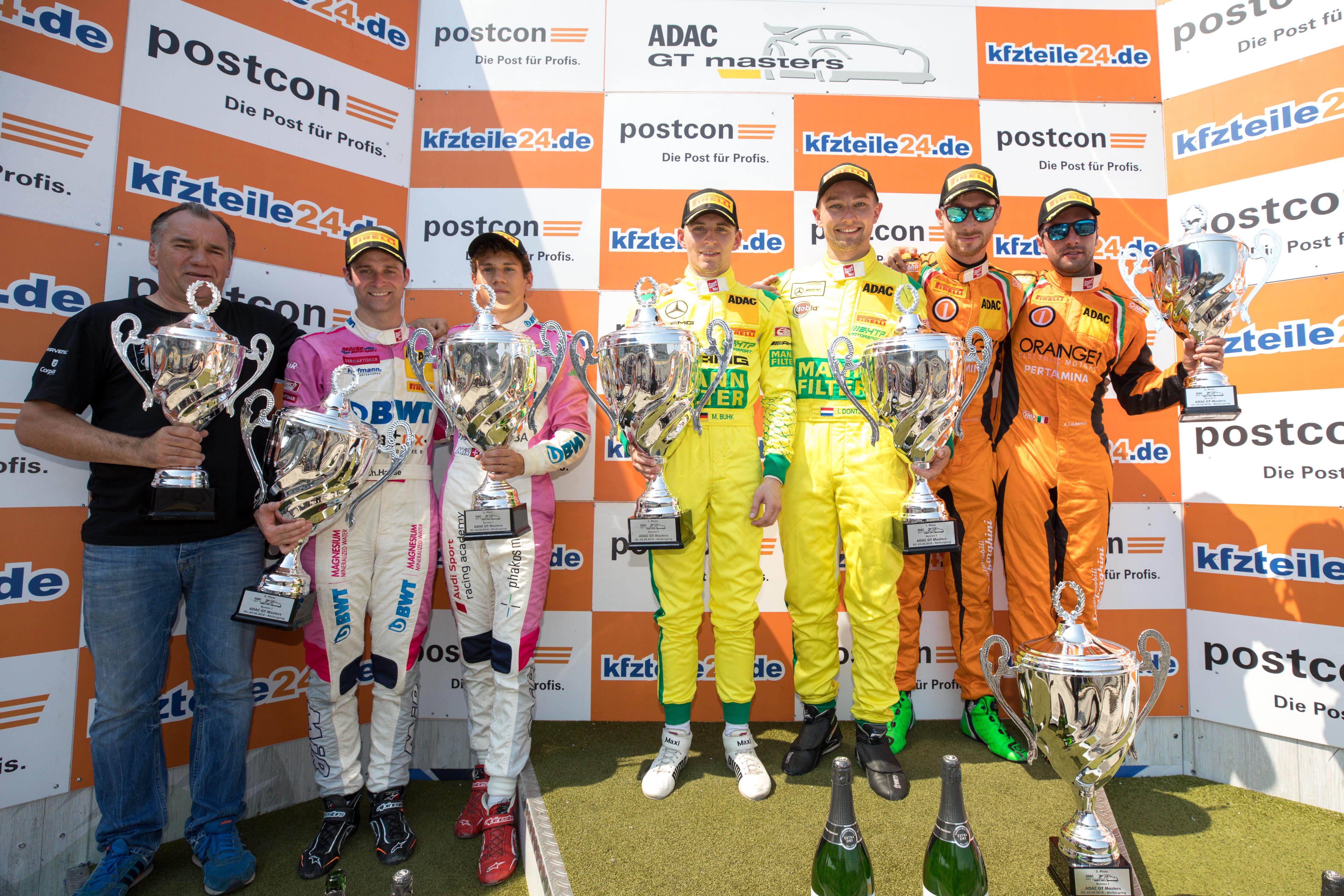 ADAC GT Masters, Nürburgring, Podium, ORANGE1 by GRT Grasser, Andrea Caldarelli, Mirko Bortolotti, MANN-FILTER Team HTP, Indy Dontje, Maximilian Buhk, BWT Mücke Motorsport, Ricardo Feller, Christopher Haase