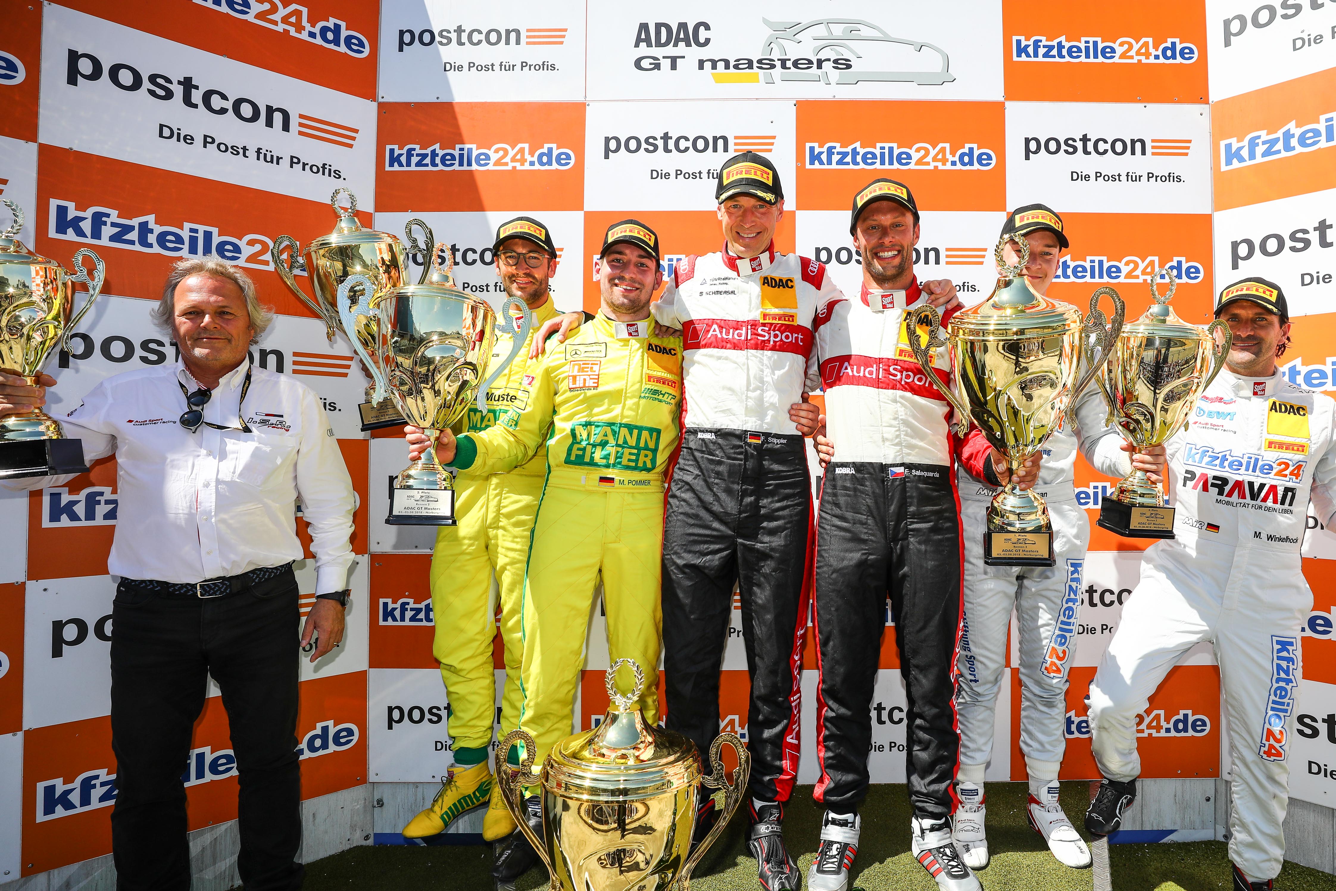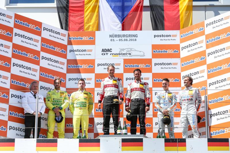 ADAC GT Masters, Nürburgring, MANN-FILTER Team HTP, Maximilian Götz, Markus Pommer, BWT Mücke Motorsport, Mike David Ortmann, Markus Winkelhock, Team ISR, Filip Salaquarda, Frank Stippler, Podium