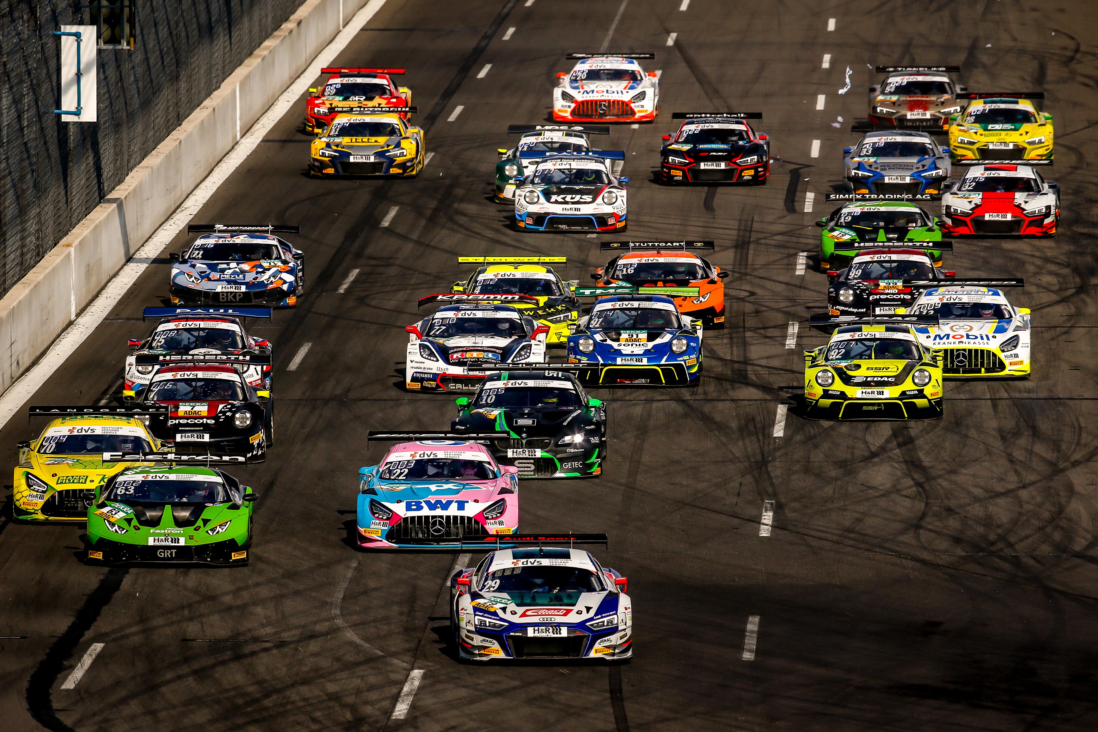 #29 / Montaplast by Land Motorsport / Audi R8 LMS / Ricardo Feller, #13 / Team Zakspeed Mobil Krankenkasse Racing / Mercedes-AMG GT3 Evo / Igor Waliłko, #33 / Rutronik Racing by Tece / Audi R8 LMS / Kim-Luis Schramm / Dennis Marschall, #19 / GRT Grasser Racing Team / Lamborghini Huracán GT3 Evo / Rolf Ineichen