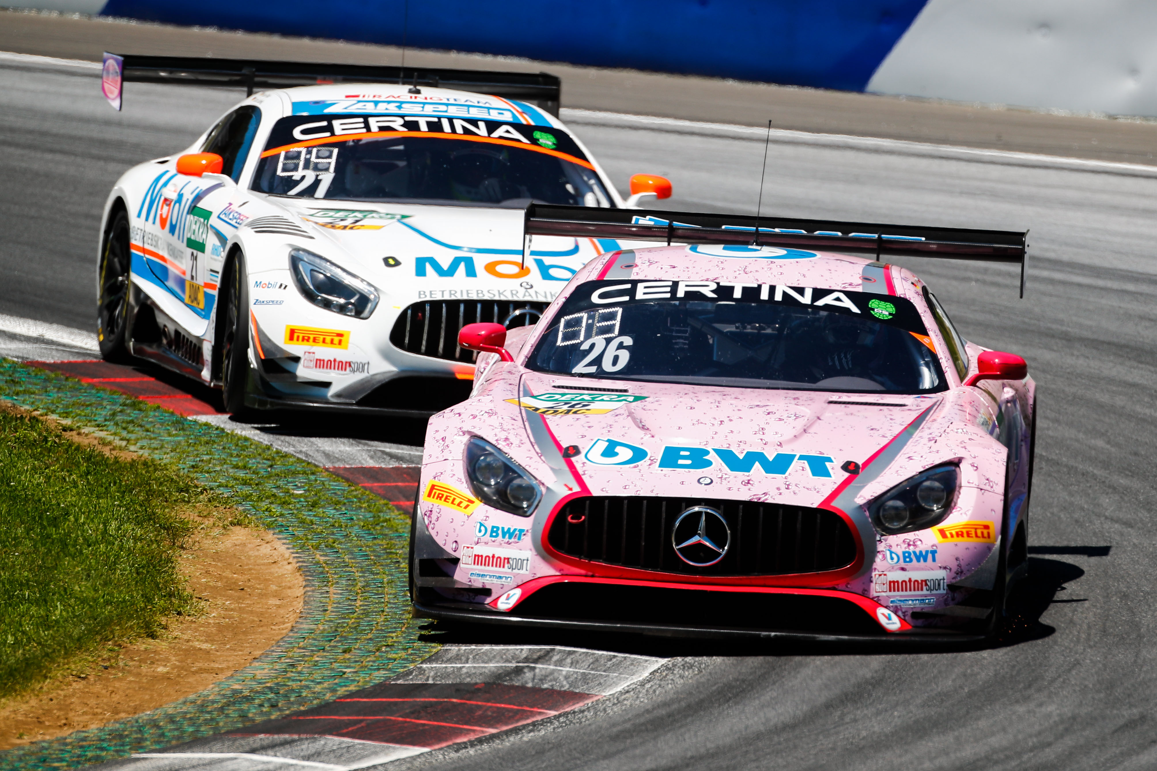 Leidtragende des Überholmanövers von Gounon waren Patrick Assenheimer (25/Lehrensteinsfeld) und Maximilian Götz (31/Uffenheim, beide Mercedes-AMG Team HTP Motorsport), die mit ihrem Mercedes-AMG um lediglich 0,9 Sekunden ihren ersten Podestplatz des Jahres verpassten. Direkt hinter ihnen kamen Ricky Collard (20/GB) und Philipp Eng (27/A, beide BMW Team Schnitzer) im BMW M6 ins Ziel und schoben sich so auf Tabellenrang zwei nach vorn. Die Mercedes-Paarungen Luca Stolz (21/Brachbach) und Luca Ludwig (27/Bornheim, beide Mercedes-AMG Team ZAKSPEED) sowie Indy Dontje (24/NL) und Marvin Kirchhöfer (23/Markkleeberg, beide Mercedes-AMG Team HTP Motorsport) wurden Sechste und Siebte.