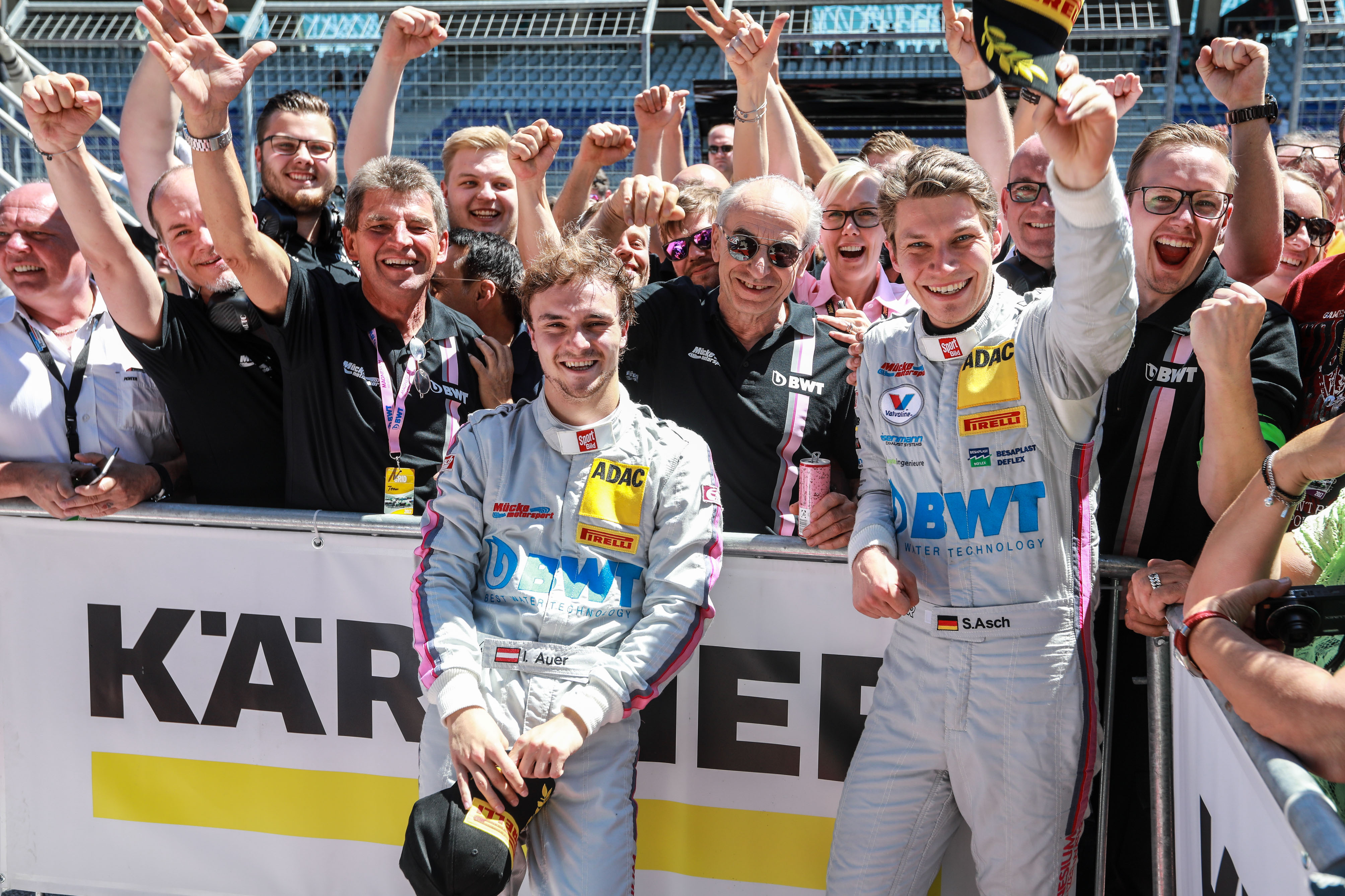 Auf den Verfolgerpositionen sorgten spannende Kämpfe für beste Unterhaltung. Platz zwei holten schließlich Lucas Auer und Sebastian Asch. Für DTM-Star Auer war es an seinem ersten Rennwochenende in der "Liga der Supersportwagen" gleich der erste Podestplatz, auch für das Team BWT Mücke Motorsport, das seine erste Saison im ADAC GT Masters bestreitet, war es eine Podiumspremiere. Erst in der vorletzten Runde sicherte Jules Gounon (22/F, Callaway Competition) sich und Partner Daniel Keilwitz (27/Villingen) die dritte Position. Das Corvette-Duo, das das Rennen am Samstag gewonnen hatte, baute damit seine Tabellenführung aus.