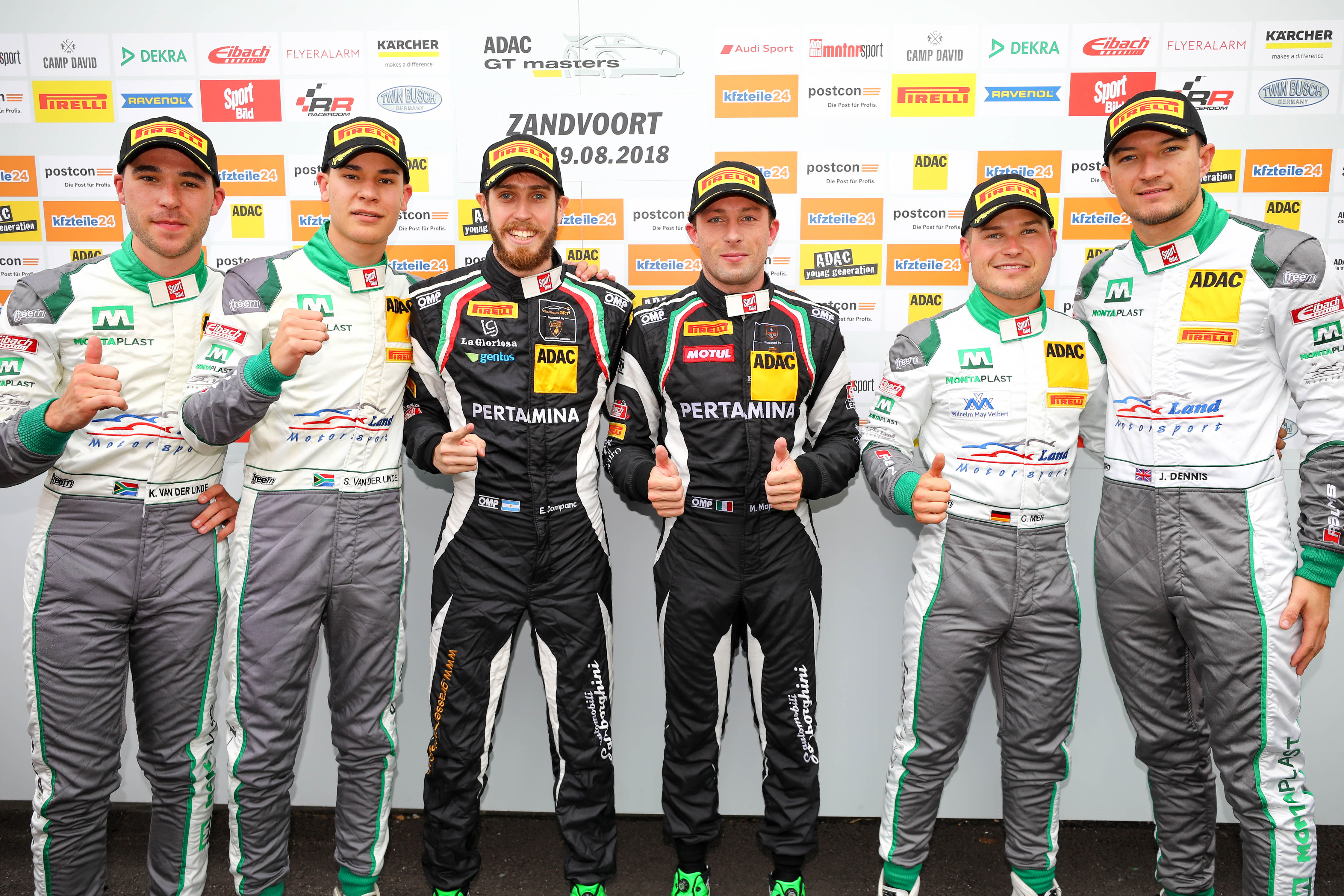 Zandvoort: The winners of Saturday’s ADAC GT Masters race at Zandvoort were Ezequiel Perez Companc (24, RA) and Marco Mapelli (31, ITA, both GRT Grasser Racing Team). The Lamborghini drivers prevailed by the relatively narrow margin of 0.703 seconds over Sheldon van der Linde (19, ZA) and Kelvin van der Linde (22, ZA, both Montaplast by Land-Motorsport) in an Audi R8 LMS and their third-placed Montaplast team-mates Jake Dennis (24, GB) and Christopher Mies (29, GER). “I am very happy about this victory,” said pole-sitter and race winner Perez Companc. “The race was very tough, as our pursuers put us under constant pressure. The fans saw a lot of wheel-to-wheel action today.”