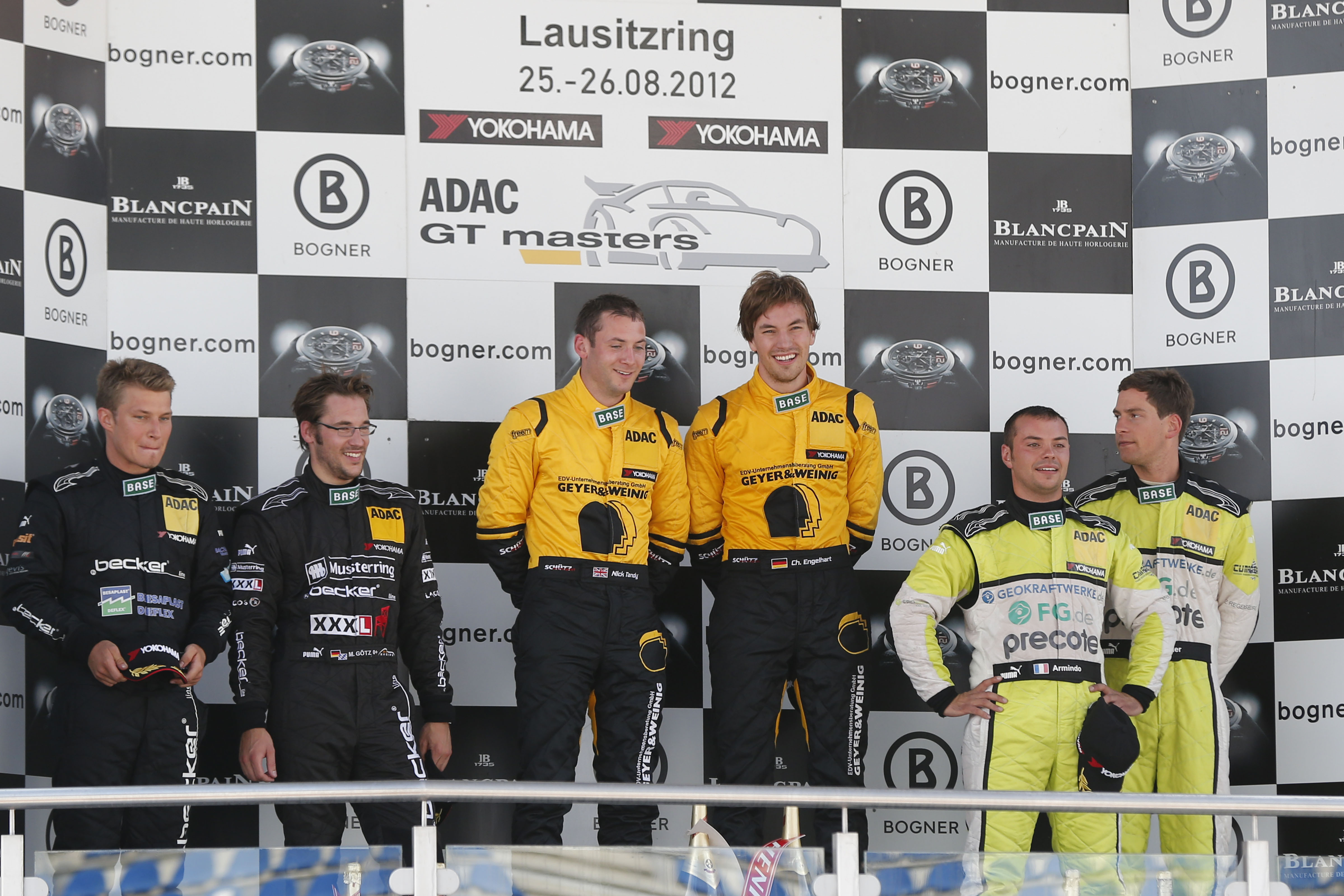 Traumwetter und ein Herzschlagfinale mit einem Türklinkenduell um den Sieg: Das ADAC GT Masters begeisterte die Fans auf dem Lausitzring mit einer spannenden Schlussphase. Christian Engelhart (25, Kösching) und Nick Tandy (27, GB / Team Geyer & Weinig EDV – Schütz Motorsport) fuhren im Porsche 911 nach einem hart erkämpften Start-Ziel-Sieg mit 0,4 Sekunden Vorsprung vor dem Mercedes-Benz SLS AMG von Sebastian Asch (26, Ammerbuch)/Maximilian Götz (26, Uffenheim / kfzteile24 MS RACING Team) über die Ziellinie. „Das war ein toller und sehr fairer Kampf“, waren sich nach dem Rennen sowohl Sieger Tandy wie auch Kontrahent Götz einig.