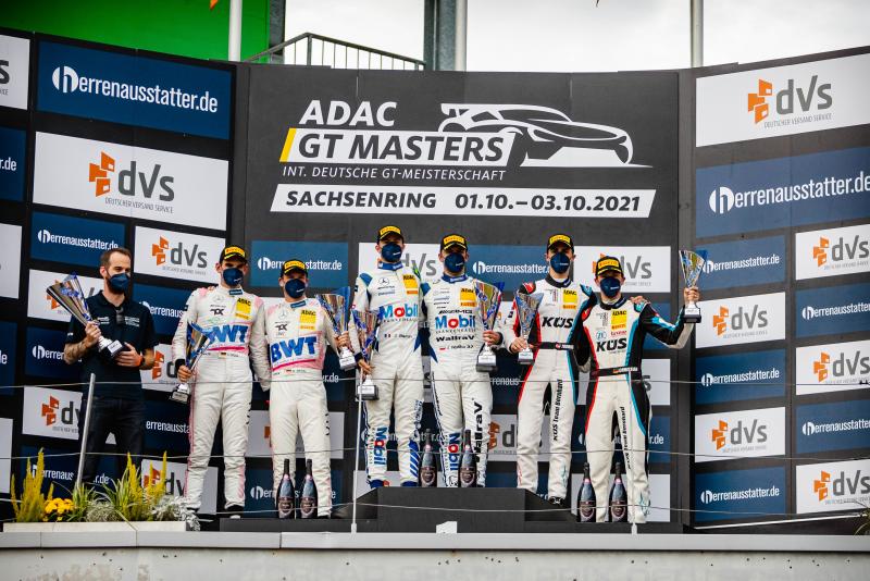 Hohenstein-Ernstthal. Hochspannung im Titelkampf der Deutschen GT-Meisterschaft: Vier Rennen vor dem Saisonende ist der Vorsprung der Tabellenführer Ricardo Feller (21/CH) und Christopher Mies (31/Düsseldorf, beide Montaplast by Land-Motorsport) im Audi R8 nach Platz Fünf im Sonntagsrennen auf dem Sachsenring auf zwei Punkte geschrumpft. Die heimlichen Sieger waren am Sonntag Luca Stolz (26/Brachbach) und Maro Engel (36/Monte Carlo, beide Mercedes-AMG Team Toksport WRT), die die zahlreichen Zuschauer mit einem starken Manöver in der letzten Kurve begeisterten, das ihnen Rang zwei und auch Tabellenrang zwei einbrachte. Mit ihrem vierten zweiten Platz in Folge komplettierten die beiden Mercedes-AMG-Werksfahrer einen Doppelsieg für ihren Arbeitgeber, denn ihre Markenkollegen Igor Waliłko (24/PL) und Jules Gounon (26/F, beide Team Zakspeed Mobil Krankenkasse Racing) fuhren von der Pole-Position zu einem ungefährdeten Sieg. Rang drei ging an das Porsche-Duo Thomas Preining (23/A) und Christian Engelhart (34/Starnberg, beide Küs Team Bernhard). „Ein wirklich toller Tag“, jubelte Sieger Gounon. „Ich liebe diese Strecke einfach. Hier habe ich 2016 meinen ersten GT3-Sieg geholt, das war der Startschuss für meine Karriere. Jetzt wieder hier zu siegen ist fantastisch. Es hat einfach alles gepasst. Pole, schnellste Runde und Sieg – besser konnte es nicht laufen. Wir sind jetzt die Außenseiter im Titelkampf!“
