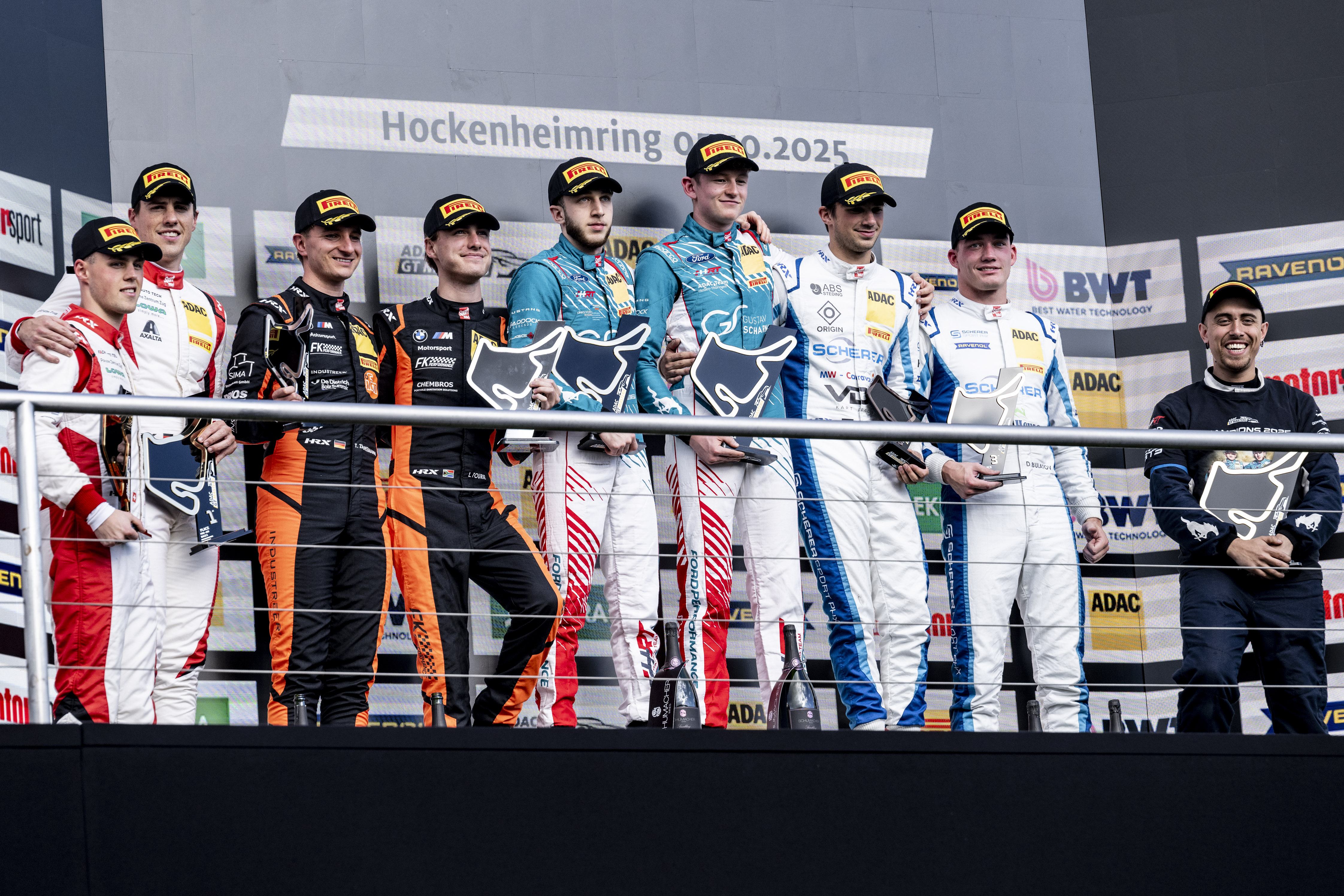 Hockenheim. Die Champions des ADAC GT Masters in Höchstform: Salman Owega (20/Köln)/Finn Wiebelhaus (19/Obertshausen/beide Haupt Racing Team) haben das letzte Rennen der Saison in Hockenheim für sich entschieden. Das Duo lag im Ford Mustang GT3 1,770 Sekunden vor den neuen Vizemeistern Tim Zimmermann (29/Langenargen)/Leyton Fourie (20/RSA/beide FK Performance Motorsport) mit dem BMW M4 GT3 Evo. „Ich bin so happy, dass wir dieses Rennen noch gewinnen konnten. Wir haben die Saison stark begonnen und sie auch so beendet“, jubelte Wiebelhaus. „Ich wusste, dass ich im Rennen hier schnell sein würde. Nach dem Gewinn der Meisterschaft konnte ich endlich komplett frei fahren und absolut alles geben. Es hat einfach nur Spaß gemacht.“ Teamkollege Owega fügte hinzu: „Besser hätten wir die Saison nicht beenden können. Ich hatte schon erwartet, dass Finn noch ein bisschen nach vorne kommt, aber dass es so gut ausgeht, hätte ich nicht gedacht.“ Das Podium komplettierten die Vortagessieger Nico Hantke (21/Hürth)/Denis Bulatov (26/Scherer Sport PHX) im Audi R8 LMS GT3 Evo 2.