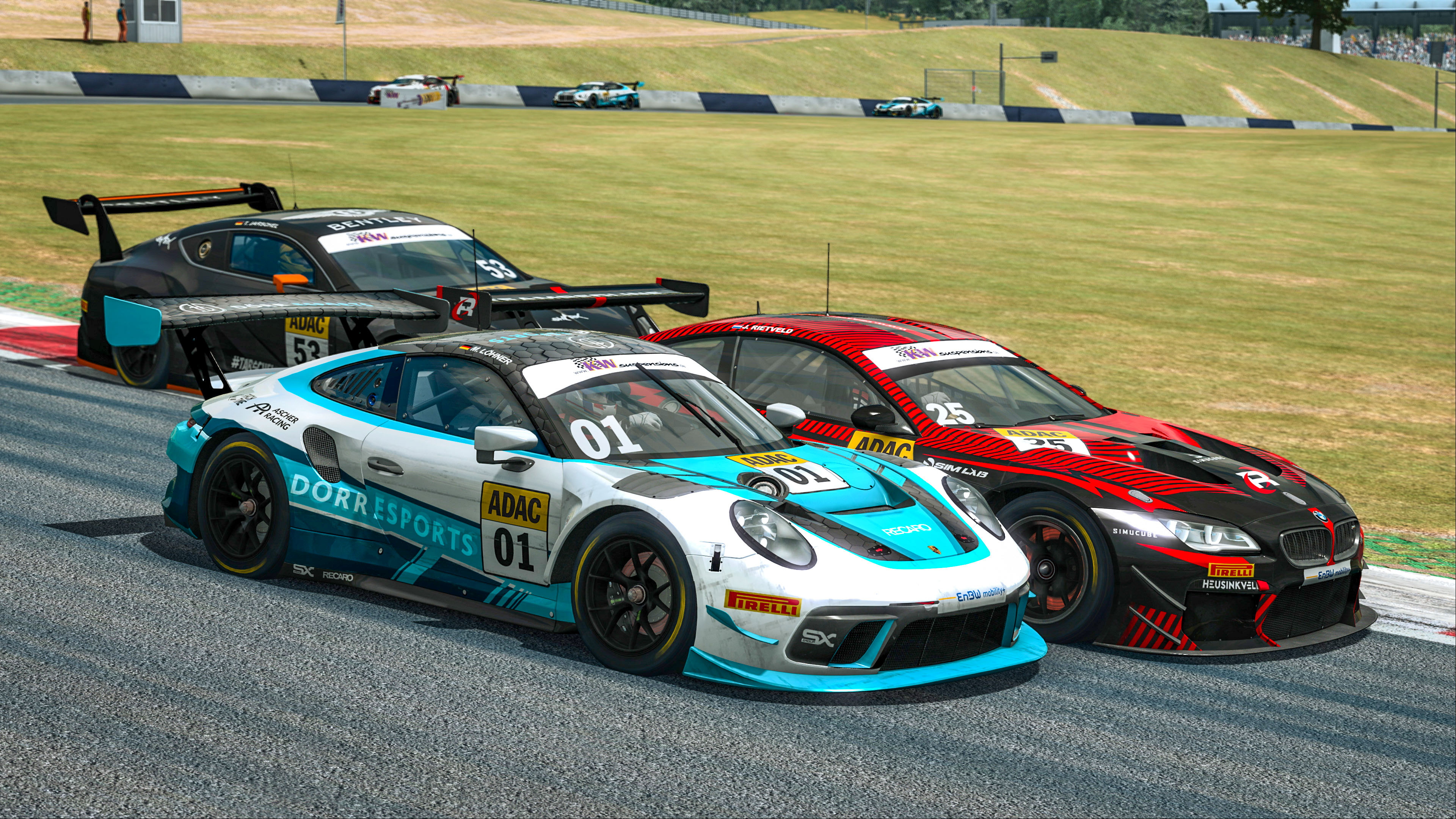 Zunächst sah es so aus als hätte Gassner den Start ins 40-minütige Hauptrennen verschlafen, doch der ehemalige ADAC GT Masters-Fahrer schaffte es noch, sich auf Position zwei hinter Hasse einzureihen. Hinter den beiden Audi-Piloten folgte eine große Bentley-Kampfgruppe, in der Löhner mit seinem Porsche festhing. So trat der Dörr Esports-Pilot so früh wie möglich zu seinem Boxenstopp an, um im Anschluss freie Fahrt zu haben. Die Taktik ging auf und Löhner lag nach Ende des Boxenstoppfensters auf Rang drei hinter Teamkollege Hasse und Gassner. Von dort aus startete er den Angriff auf die Führung: Wenig später nutzte Löhner einen Fehler von Gassner und übernahm Rang zwei hinter seinem Teamkollegen Haase. Nachdem sich die beiden Dörr Esports-Piloten etwas absetzen konnten, entbrannte ein spannender Zweikampf, der in einem Fotofinish mit Vorteil Hasse endete. „Das war ein schweißtreibendes und spannendes Rennen“, so der Sieger. „Moritz und ich, wir haben uns zunächst etwas abgesetzt und in den letzten beiden Runden hieß es: Volle Attacke.“ Auch Gassner musste seinen dritten Platz bis zur Ziellinie hart gegen Rietveld verteidigen. „Es war ein gutes Rennen“, fasst Gassner zusammen. „Wenn ich aggressiver gefahren wäre, wäre vielleicht noch mehr drin gewesen. Auf der anderen Seite, wenn man zu viel angreift, können die Verfolger aufholen. Von daher, bin ich zufrieden.“