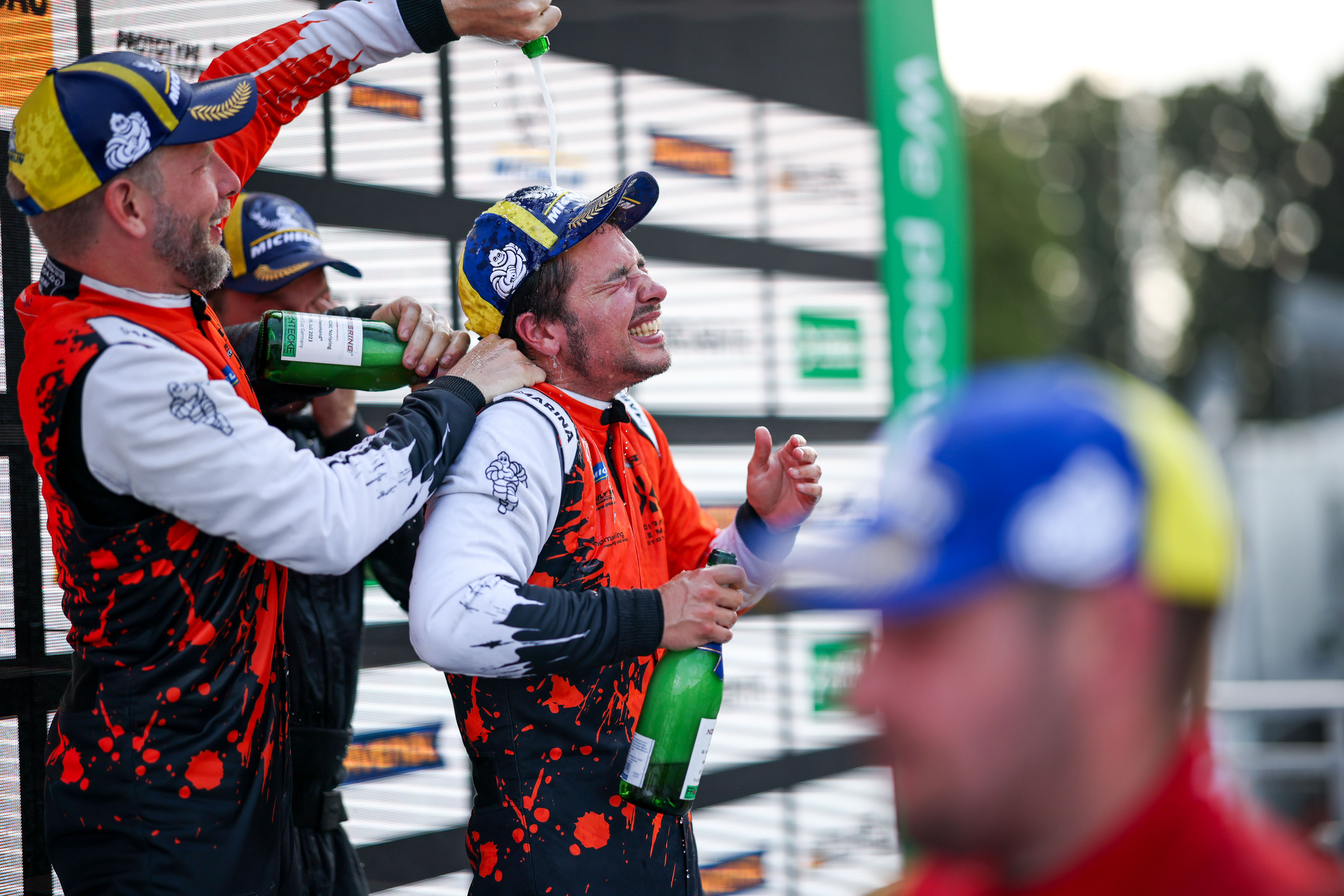 Das Treppchen nach dem ersten Durchgang von Nürnberg (v.l.n.r): Belén García Espinar, Xavier Lloveras (beide Zweite), Christian Hauser (Teamchef Siegerteam Racing Experience), Gary Hauser, Markus Pommer (beide Sieger), Julien Apothéloz, Oscar Tunjo (beide
