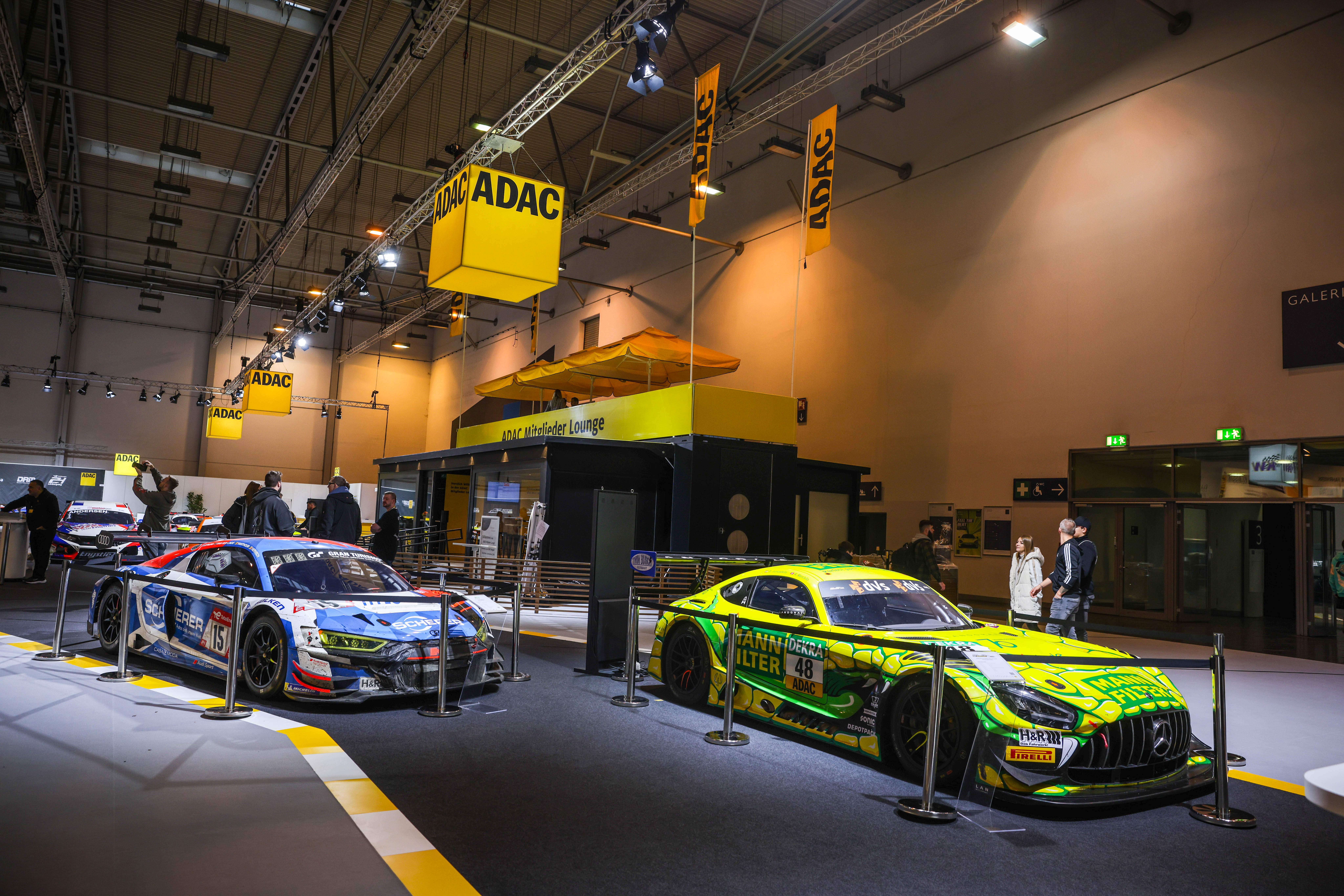 ADAC auf der Essen Motor Show 2022: Links der Audi R8 LMS Evo2, Siegerfahrzeug beim 24h-Rennen Nürburgring und rechts der Mercedes-AMG GT3 von Raffaele Marciello, ADAC GT Masters Champion 2022