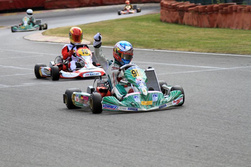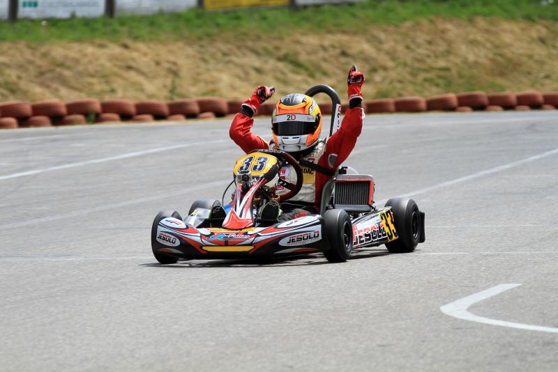 Nach einer bisher souveränen Vorstellung des amtierenden Champions Michele Di Martino (Eitorf/Energy Germany), mit vier Siegen in vier Rennen, kam es in Ampfing zur Wachablösung. Kevin Illgen (Callenberg/CRG Racing Germany) führte die Getriebekart-Klasse nach den Heats an und auch im ersten Rennen ging kein Weg an dem Sachsen vorbei. Mit einer konstanten Performance hielt er seine Gegner in Schach und feierte seinen ersten Erfolg in dieser Saison. „Nachdem wir bei den vergangenen Rennen immer knapp am Sieg vorbeigerutscht sind, hat es diesmal gereicht. Schon seit gestern läuft es wirklich gut für uns“, kommentiert Kevin sein Rennen. Mit einem Respektabstand erreichten Alexander Schmitz (Wesel/KSM Racing Team) und Stefan Weber (Töging/CRG Racing Germay) auf den Plätzen zwei und drei das Ziel. Gastfahrer Patrick Loidl (Pischelsdorf) wurde Vierter vor Michele Di Martino auf Platz fünf.